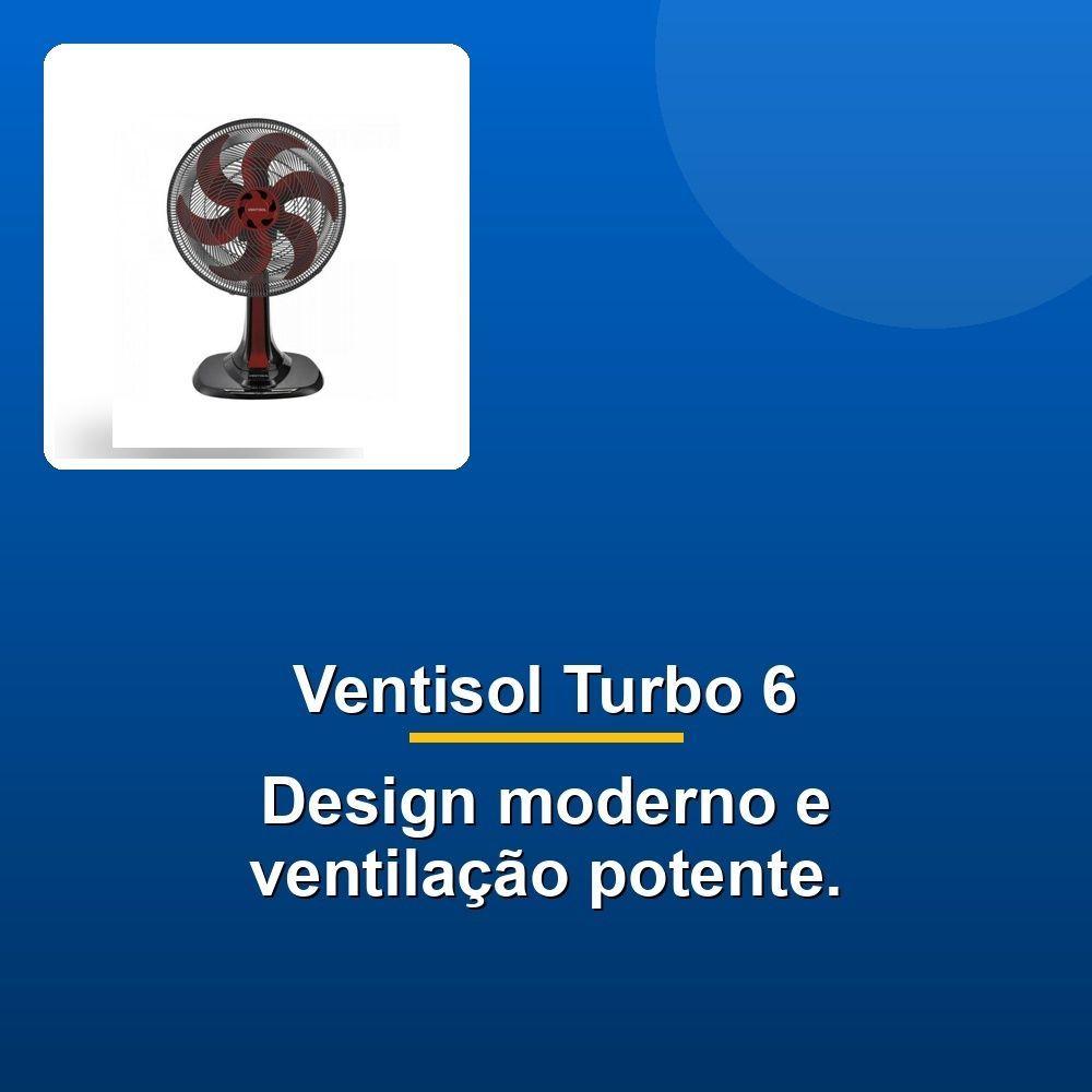 Ventisol Ventilador Mesa Turbo 6 30cm Vermelho 127vSinta a brisa fresca e revigorante do Ventilador de Mesa Ventisol Turbo 6! Feito para toda a família, este ventilador oferece uma sensação de conforto e bem-estar em qualquer ambiente. Equipado com um motor turbo de alta performance e uma hélice de 6 pás, ele proporciona uma ventilação potente e silenciosa, mesmo em velocidades mais altas.Destaca-se por seu design moderno e arrojado, com nova base e acabamento da grade, que garantem maior estabilidade e um visual contemporâneo. Com três velocidades ajustáveis na capa protetora do motor, você pode personalizar o fluxo de ar de acordo com sua preferência. A tecnologia Wind-line da grade garante uma melhor vazão e direcionamento do ar, enquanto a oscilação automática garante uma distribuição uniforme do vento por todo o ambiente.Seja para a mesa de canto, no chão ou até mesmo pendurado na parede, o Ventisol Turbo 6 é versátil o suficiente para se adaptar a qualquer ambiente. O suporte de parede integrado, aliado à regulagem de inclinação manual, permite diferentes posições de uso, otimizando a sua experiência. E pensando na sua economia, o Ventisol Turbo 6 é classificado como Classe A no INMETRO, o que significa maior eficiência energética e uma menor conta de luz. Desfrute de um verão mais refrescante e aconchegante, com o Ventilador de Mesa Ventisol Turbo 6.Sinta a brisa fresca e revigorante do Ventilador de Mesa Ventisol Turbo 6! Feito para toda a família, este ventilador oferece uma sensação de conforto e bem-estar em qualquer ambiente. Equipado com um motor turbo de alta performance e uma hélice de 6 pás, ele proporciona uma ventilação potente e silenciosa, mesmo em velocidades mais altas.Destaca-se por seu design moderno e arrojado, com nova base e acabamento da grade, que garantem maior estabilidade e um visual contemporâneo. Com três velocidades ajustáveis na capa protetora do motor, você pode personalizar o fluxo de ar de acordo com sua preferência. A tecnologia Wind-line da grade garante uma melhor vazão e direcionamento do ar, enquanto a oscilação automática garante uma distribuição uniforme do vento por todo o ambiente.Seja para a mesa de canto, no chão ou até mesmo pendurado na parede, o Ventisol Turbo 6 é versátil o suficiente para se adaptar a qualquer ambiente. O suporte de parede integrado, aliado à regulagem de inclinação manual, permite diferentes posições de uso, otimizando a sua experiência. E pensando na sua economia, o Ventisol Turbo 6 é classificado como Classe A no INMETRO, o que significa maior eficiência energética e uma menor conta de luz. Desfrute de um verão mais refrescante e aconchegante, com o Ventilador de Mesa Ventisol Turbo 6.