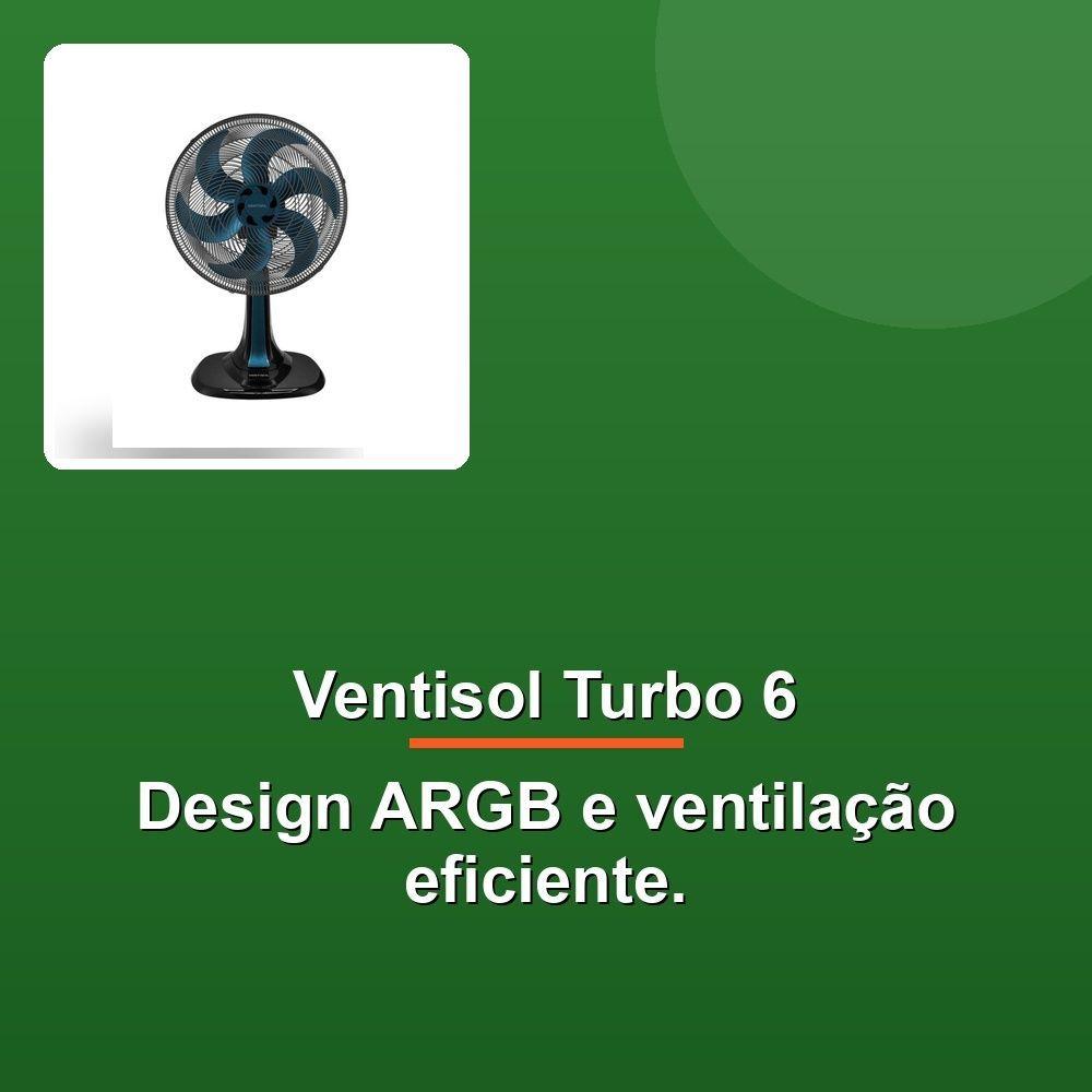 Ventisol Ventilador Mesa Turbo 6 40cm Azul 127vO Ventilador de Mesa Ventisol Turbo 6 de 40cm é a solução ideal para garantir um ambiente fresco e confortável durante os dias mais quentes. Com seu motor turbo de alta performance e hélice de 6 pás de nova aerodinâmica, o Ventisol Turbo 6 proporciona uma ventilação potente e silenciosa, circulando o ar com eficiência. A nova base e o acabamento da grade foram redesenhados com um estilo moderno e arrojado, garantindo maior estabilidade para o ventilador.Para controlar a intensidade do vento, você possui três velocidades ajustáveis através de um prático controle integrado na capa protetora do motor. A tecnologia Wind-line na grade oferece um direcionamento de ar mais preciso e organizado, resultando em uma experiência de ventilação ainda mais eficiente. Com a oscilação horizontal automática, o Ventisol Turbo 6 pode mover-se suavemente, alcançando uma área maior e proporcionando conforto em todo o ambiente.A regulagem de inclinação manual permite ajustar o ângulo do ventilador de acordo com suas necessidades, direcionando o fluxo de ar exatamente para onde você deseja. Além disso, o Ventisol Turbo 6 conta com a certificação Classe A no INMETRO, garantindo a melhor classificação de energia do mercado. A economia de energia se une a um design moderno e funcional, permitindo que o ventilador seja usado em diversas situações – no chão, na mesa ou até mesmo fixado na parede com o suporte integrado. Experimente o conforto e a praticidade do Ventilador de Mesa Ventisol Turbo 6 azul e transforme seu dia a dia!O Ventilador de Mesa Ventisol Turbo 6 de 40cm é a solução ideal para garantir um ambiente fresco e confortável durante os dias mais quentes. Com seu motor turbo de alta performance e hélice de 6 pás de nova aerodinâmica, o Ventisol Turbo 6 proporciona uma ventilação potente e silenciosa, circulando o ar com eficiência. A nova base e o acabamento da grade foram redesenhados com um estilo moderno e arrojado, garantindo maior estabilidade para o ventilador.Para controlar a intensidade do vento, você possui três velocidades ajustáveis através de um prático controle integrado na capa protetora do motor. A tecnologia Wind-line na grade oferece um direcionamento de ar mais preciso e organizado, resultando em uma experiência de ventilação ainda mais eficiente. Com a oscilação horizontal automática, o Ventisol Turbo 6 pode mover-se suavemente, alcançando uma área maior e proporcionando conforto em todo o ambiente.A regulagem de inclinação manual permite ajustar o ângulo do ventilador de acordo com suas necessidades, direcionando o fluxo de ar exatamente para onde você deseja. Além disso, o Ventisol Turbo 6 conta com a certificação Classe A no INMETRO, garantindo a melhor classificação de energia do mercado. A economia de energia se une a um design moderno e funcional, permitindo que o ventilador seja usado em diversas situações – no chão, na mesa ou até mesmo fixado na parede com o suporte integrado. Experimente o conforto e a praticidade do Ventilador de Mesa Ventisol Turbo 6 azul e transforme seu dia a dia!