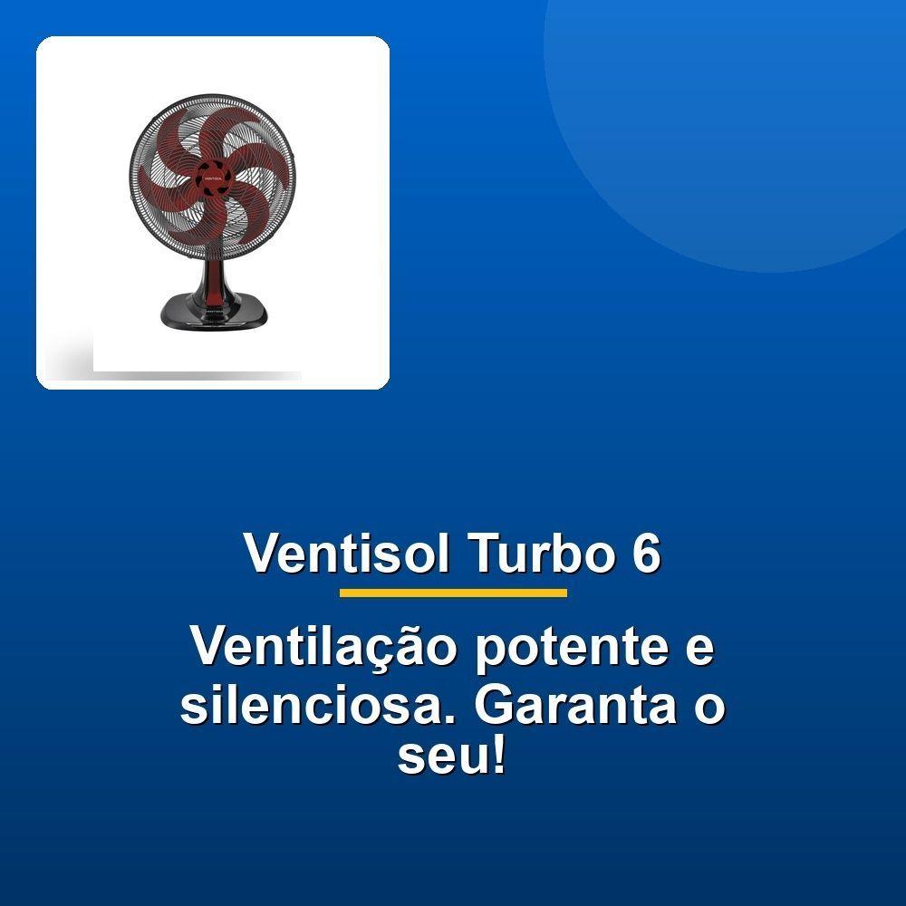 Ventisol Ventilador Mesa Turbo 6 40cm Vermelho 220vCansado de calor e um ambiente sufocante? Apresentamos o Ventilador de Mesa Ventisol Turbo 6, a solução perfeita para você desfrutar de um ambiente fresco e agradável.Com seu motor turbo de alta performance e a inovadora hélice de 6 pás, o Ventisol Turbo 6 proporciona uma ventilação poderosa e silenciosa, garantindo seu conforto sem interrupções. O design moderno e arrojado, com base redesenhada e acabamento da grade que transcende a praticidade, garante maior estabilidade para o ventilador, complementando a estética do seu ambiente.Controle a intensidade da brisa com três velocidades ajustáveis através do prático controle localizado na capa protetora do motor. A tecnologia Wind-line nas grades proporciona uma melhor vazão e direcionamento de ar, direcionando a ventilação exatamente onde você precisa.A oscilação automática horizontal garante que o Ventisol Turbo 6 alcance uma área maior, combatendo o calor de maneira uniforme. Ajuste o ângulo do ventilador com a regulagem de inclinação manual, personalizando a direção do fluxo de ar para suas necessidades.Com certificação Classe A no INMETRO, o Ventisol Turbo 6 garante a melhor classificação de energia, sendo econômico e aliado da sua qualidade de vida. Além disso, o suporte de parede integrado oferece a flexibilidade de usar o ventilador no chão, na mesa ou fixá-lo na parede, adaptando-se perfeitamente às suas preferências e necessidades. Agradável, eficiente e versátil - o Ventisol Turbo 6 é a escolha inteligente para um ambiente mais fresco e confortável.Cansado de calor e um ambiente sufocante? Apresentamos o Ventilador de Mesa Ventisol Turbo 6, a solução perfeita para você desfrutar de um ambiente fresco e agradável.Com seu motor turbo de alta performance e a inovadora hélice de 6 pás, o Ventisol Turbo 6 proporciona uma ventilação poderosa e silenciosa, garantindo seu conforto sem interrupções. O design moderno e arrojado, com base redesenhada e acabamento da grade que transcende a praticidade, garante maior estabilidade para o ventilador, complementando a estética do seu ambiente.Controle a intensidade da brisa com três velocidades ajustáveis através do prático controle localizado na capa protetora do motor. A tecnologia Wind-line nas grades proporciona uma melhor vazão e direcionamento de ar, direcionando a ventilação exatamente onde você precisa.A oscilação automática horizontal garante que o Ventisol Turbo 6 alcance uma área maior, combatendo o calor de maneira uniforme. Ajuste o ângulo do ventilador com a regulagem de inclinação manual, personalizando a direção do fluxo de ar para suas necessidades.Com certificação Classe A no INMETRO, o Ventisol Turbo 6 garante a melhor classificação de energia, sendo econômico e aliado da sua qualidade de vida. Além disso, o suporte de parede integrado oferece a flexibilidade de usar o ventilador no chão, na mesa ou fixá-lo na parede, adaptando-se perfeitamente às suas preferências e necessidades. Agradável, eficiente e versátil - o Ventisol Turbo 6 é a escolha inteligente para um ambiente mais fresco e confortável.