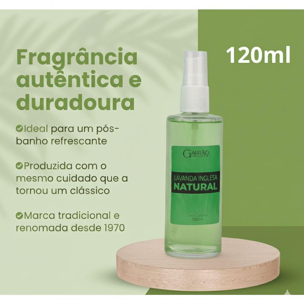 Colônia Lavanda Inglesa Natural Garrão 120mlColônia Lavanda Inglesa Natural GarrãoUm Clássico de Elegância que Atravessa o TempoA Colônia Lavanda Inglesa Natural Garrão traduz a sofisticação de outras épocas em uma fragrância marcante e cheia de personalidade. Inspirada no charme dos anos 1970, ela transforma o cuidado diário em um verdadeiro ritual de bem-estar, frescor e distinção.Equilibrada e acolhedora, essa colônia é perfeita para quem aprecia aromas clássicos, limpos e elegantes, capazes de trazer conforto e refinamento ao longo de todo o dia. A Essência do Clássico AtemporalFrescor Puro e RevitalizanteA união da lavanda com notas de eucalipto e menta oferece uma sensação imediata de limpeza e leveza, ideal para o pós-banho e para renovar as energias.Elegância com Toque RetrôNo coração da fragrância, um delicado buquê floral revela suavidade e charme clássico, remetendo à sofisticação das fragrâncias tradicionais.Conforto que PermaneceA base quente, composta por madeiras nobres, fava tonka, pau-rosa e musk, envolve a pele com uma aura aconchegante e refinada, deixando um rastro elegante e memorável.Tradição e Qualidade GarrãoProduzida com o cuidado e a dedicação que consagraram a Garrão, esta colônia preserva a autenticidade de uma fragrância clássica e confiável. Uma Experiência Olfativa ElegantePertencente à família Floral Aromático (Eau Fraîche), a Lavanda Inglesa Garrão revela uma construção harmoniosa e sofisticada:Notas de SaídaLavanda fresca combinada ao toque estimulante do eucalipto e da menta, despertando os sentidos com leveza.Notas de CoraçãoGerânio, flor de laranjeira e rosa formam um buquê floral delicado, elegante e atemporal.Notas de FundoFava tonka, madeiras nobres, pau-rosa e musk garantem fixação confortável e um acabamento suave e sofisticado. Informações do ProdutoTipo: Colônia (Eau Fraîche)Perfil Olfativo: Clássico, sofisticado e acolhedorUso: Ideal para o dia a dia, especialmente após o banhoAplicação: Spray prático para um ritual diário de cuidadoReviva o charme de uma época inesquecível e transforme sua rotina em um momento de elegância e bem-estar com a Colônia Lavanda Inglesa Natural Garrão. Um clássico que continua atual.