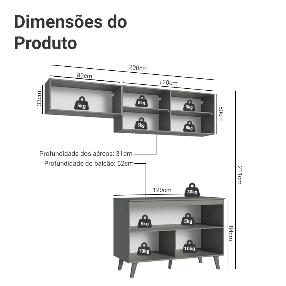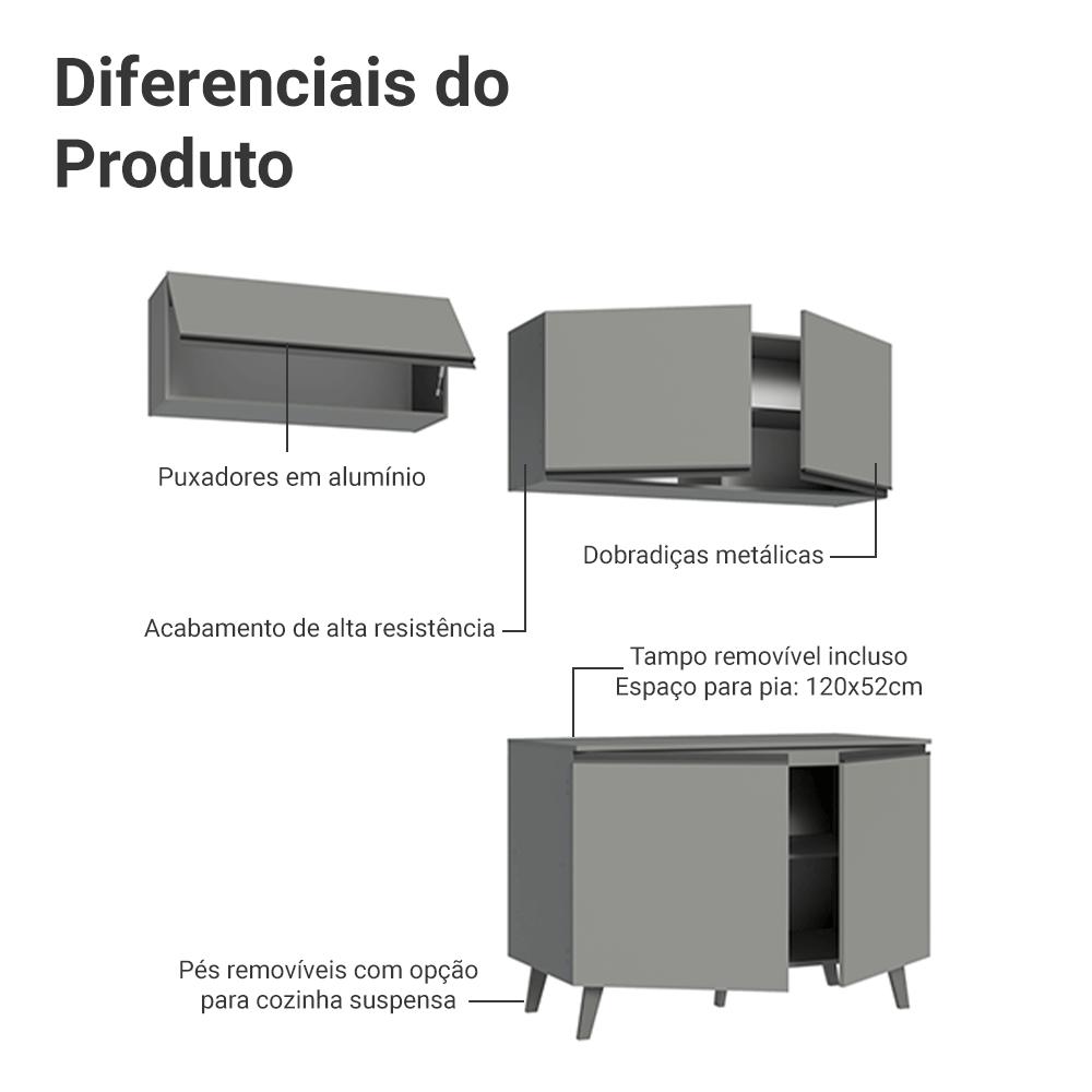 Uma opção prática e funcional para sua casa! Conheça o Armário de Cozinha Completa da linha Nice da Madesa.Super versátil, esta cozinha é formada módulos independentes que permitem que você a organize a conforme o espaço disponível no seu ambiente.Com foco na qualidade, o móvel possui puxadores em alumínio na coloração titanium, corrediças telescópicas para a abertura total das gavetas e dobradiças metálicas nas portas.Outro detalhe interessante é que o balcão acompanha tampo, que pode ser ajustado para a instalação de um cooktop ou pia de inox/pedra.Para completar, o acabamento cinza de alta resistência é moderno e segue as tendências do mercado atual de cozinhas.Medidas totais:- 211 cm de altura- 200 cm de largura- 52 cm de profundidade no balcão e 31 cm nos aéreosO que você recebe:- Um (1) Aéreo de 120 cm com duas (2) portas- Um (1) Balcão de 120 cm com duas (2) portas e tampo- Um (1) Aéreo de 80 cm com uma (1) porta basculante- Manual e ferragensCódigo do produto: XAGRNC2000013BÉ bom saber:- Imagens meramente ilustrativas- A Madesa não disponibiliza serviço de montagemA Madesa se dedica à sustentabilidade com várias iniciativas: temos uma usina própria para gerar energia que abastece uma de nossas fábricas. Selecionamos nossos fornecedores, priorizando aqueles que possuem um compromisso com a sustentabilidade e proteção do meio ambiente. Todo o plástico utilizado no setor produtivo é proveniente de reciclagem e as suas sobras são encaminhadas ao fornecedor que os recicla. Também investimos no desenvolvimento contínuo de nossos colaboradores e em ações educacionais que beneficiem a comunidade.