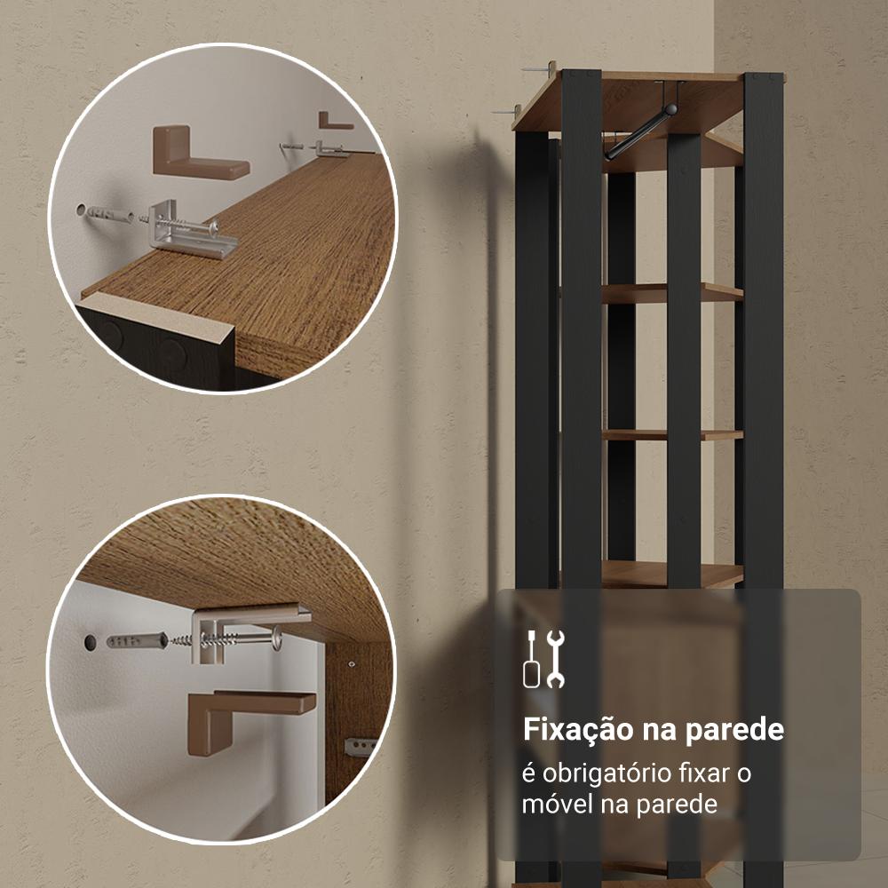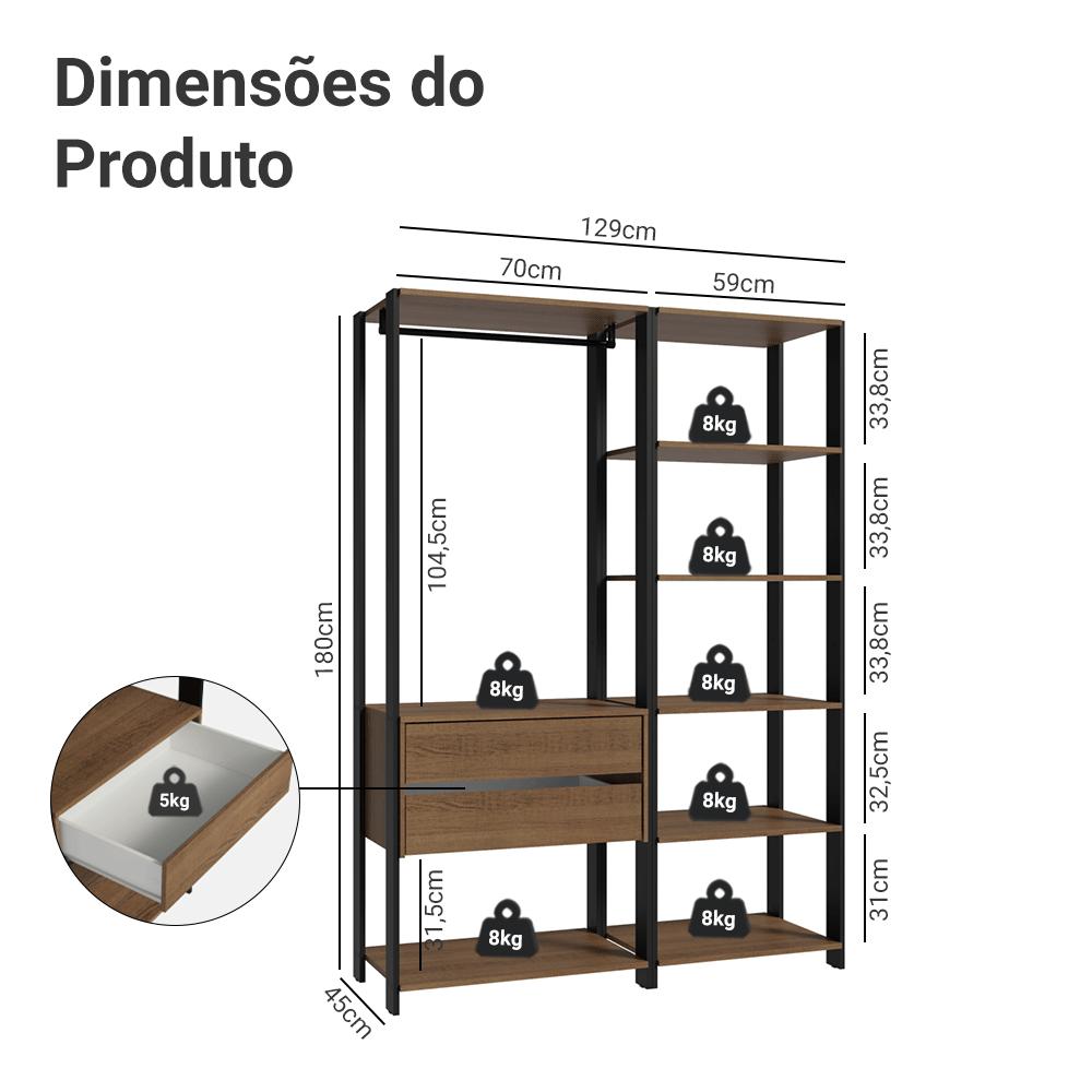 O Closet Guarda-Roupa Modulado Madesa foi projetado para otimizar o espaço e facilitar a organização de roupas e calçados. Este móvel versátil traz praticidade e um toque de modernidade ao seu quarto.Com uma estrutura aberta, oferece fácil acesso aos itens do dia a dia. Esta versão inclui duas peças separadas: uma com cabideiro metálico, prateleira e duas gavetas grandes, e a outra com cinco prateleiras amplas.Além disso, o acabamento combina os tons preto e amadeirado Rustic, proporcionando um visual sofisticado.Medidas totais:- 180 cm de altura- 129 cm de largura- 45 cm de profundidadeItens inclusos:- Um (1) Móvel de 70 cm de largura com duas (2) gavetas- Um (1) Móvel de 59 cm de largura com cinco (5) prateleirasCódigo do produto: XAMDDR0200407KObs.:- As imagens são meramente ilustrativas- A Madesa não oferece serviço de montagem- Por segurança, é obrigatório fixar o móvel na parede- Acompanha ferragens e manual com todos os passos para a montagem do produto- Estruturas laterais em MDP com pintura em preto texturizadoA Madesa se dedica à sustentabilidade com várias iniciativas: temos uma usina própria para gerar energia que abastece uma de nossas fábricas. Selecionamos nossos fornecedores, priorizando aqueles que possuem um compromisso com a sustentabilidade e proteção do meio ambiente. Todo o plástico utilizado no setor produtivo é proveniente de reciclagem e as suas sobras são encaminhadas ao fornecedor que os recicla. Também investimos no desenvolvimento contínuo de nossos colaboradores e em ações educacionais que beneficiem a comunidade.