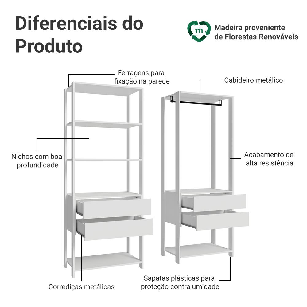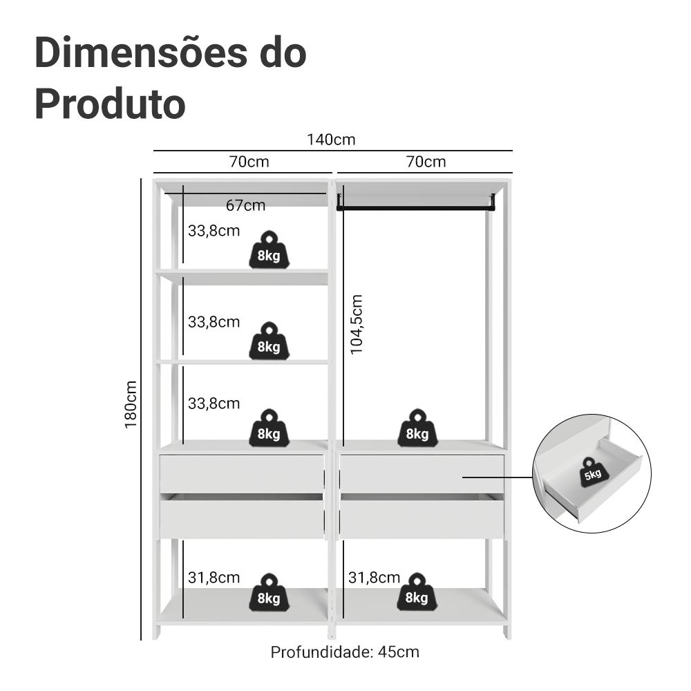 O Guarda-Roupa Closet Modulado Valência é a solução perfeita para organizar suas roupas e calçados de maneira prática, moderna e eficiente.Seu design aberto facilita o acesso às roupas e acessórios no dia a dia. São quatro gavetas com corrediças que permitem abertura total, um cabideiro metálico e cinco prateleiras amplas para manter tudo no lugar, com visibilidade e funcionalidade.Além disso, o móvel conta com acabamento branco de alta resistência, pés com sapatas plásticas que protegem contra a umidade e ferragens incluídas para a fição na parede, garantindo mais estabilidade e segurança.Medidas totais:- 180 cm de altura- 140 cm de largura- 45 cm de profundidadeO que você recebe: - Um Closet aberto de 70 cm com duas gavetas e quatro prateleiras- Um Closet aberto de 70 cm com duas gavetas, uma prateleira e um cabideiroCódigo do produto: XAMDDR02004809É importante saber:- Imagens meramente ilustrativas, a decoração não acompanha o produto.- A Madesa não oferece serviço de montagem.- O produto segue com manual e todas as ferragens necessárias para a instalação.- Por segurança, é obrigatório fir o móvel na parede.A Madesa se dedica à sustentabilidade com várias iniciativas: temos uma usina própria que gera energia para uma das fábricas. Priorizamos fornecedores responsáveis com o meio ambiente. Todo o plástico utilizado na produção é reciclado, e as sobras também são reaproveitadas. Investimos no desenvolvimento de nossos colaboradores e em ações que beneficiem a comunidade.Garantia: Este produto conta com 1 ano de garantia total, sendo 3 meses de garantia legal e 9 meses de garantia contratual. A garantia cobre exclusivamente defeitos de fabricação e vícios ocultos. Não estão cobertos: problemas decorrentes de montagem incorreta, uso inadequado, exposição à umidade, calor ou luz solar direta, modificações no produto ou desgaste natural.