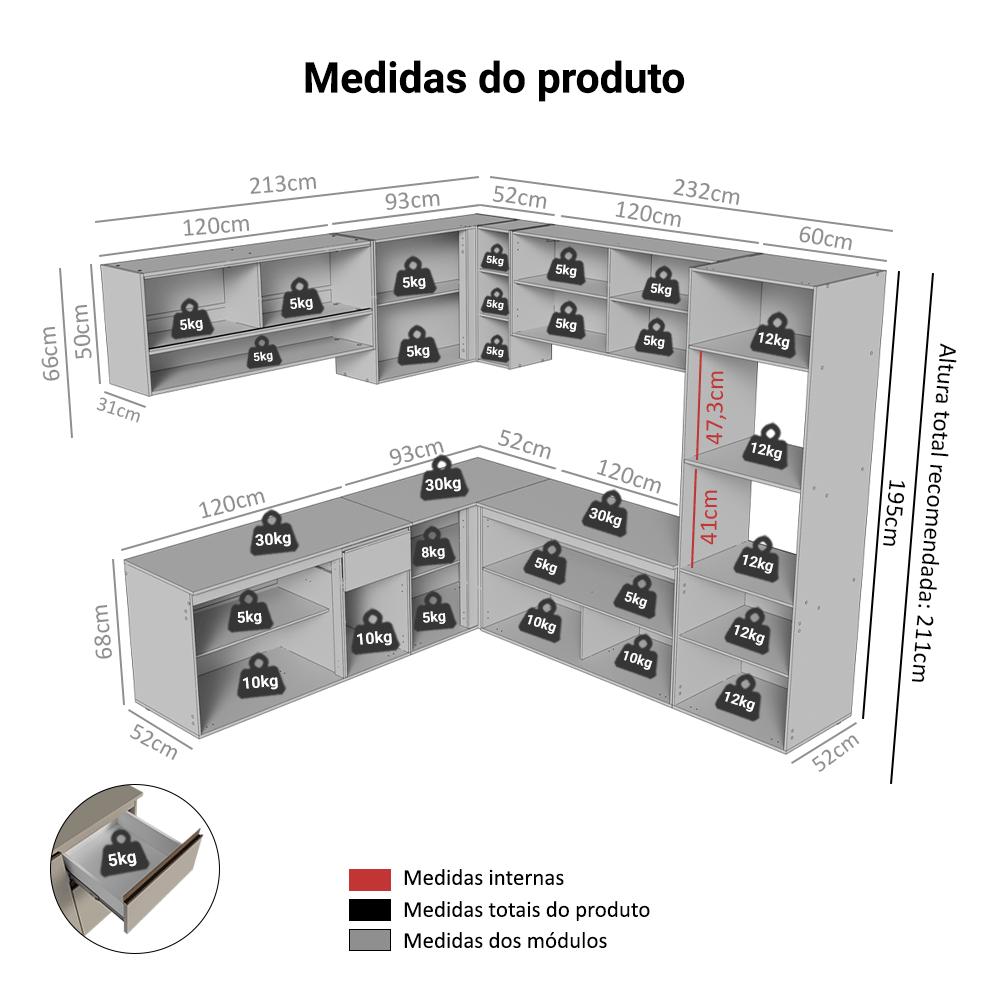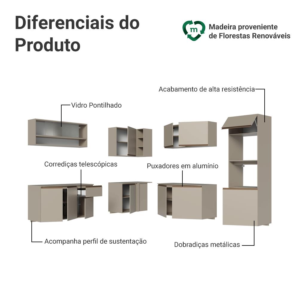 A Cozinha Nice combina um visual moderno e características que facilitam o uso no dia a dia.A linha Nice se diferencia por ser suspensa, acompanhando ferragens para fixação. O acabamento de alta resistência e os puxadores em alumínio reforçam o visual moderno, enquanto as corrediças proporcionam abertura total das gavetas. Os balcões acompanham tampo, garantindo praticidade.O destaque fica por conta do armário aéreo com porta de vidro pontilhado, adega integrada e torre quente com espaço dedicado para forno ou micro-ondas.Medidas totais:- 211 cm de altura- 445 cm de largura- 52 cm de profundidade nos balcões e torre quente e 31 cm nos aéreosInformações técnicas:- Material: MDP- Peso total suportado: 283 kgO que você recebe:- Uma Torre Quente de 60cm- Um Aéreo de 120cm- Dois Balcões de 120cm- Um Aéreo de Canto com adega acoplada- Um Balcão de Canto- Um aéreo de 120cm com vidro pontilhadoCódigo do produto:XMGCNC4450037PXMGCNC4450033BÉ importante saber:- Imagens meramente ilustrativas, a decoração não acompanha o produto- A Madesa não disponibiliza serviço de montagem- O produto segue com manual de instalação e todas as ferragens necessárias para sua montagemA Madesa possui compromisso com a sustentabilidade. Geramos energia limpa em nossa própria usina, priorizamos fornecedores responsáveis e utilizamos plástico reciclado em nossa produção. Além disso, reinserimos sobras no ciclo de reciclagem e investimos no desenvolvimento de nossos colaboradores e da comunidade.Garantia: Este produto conta com 1 ano de garantia total, sendo 3 meses de garantia legal e 9 meses de garantia contratual. A garantia cobre exclusivamente defeitos de fabricação e vícios ocultos. Não estão cobertos: problemas decorrentes de montagem incorreta, uso inadequado, exposição à umidade, calor ou luz solar direta, modificações no produto ou desgaste natural.