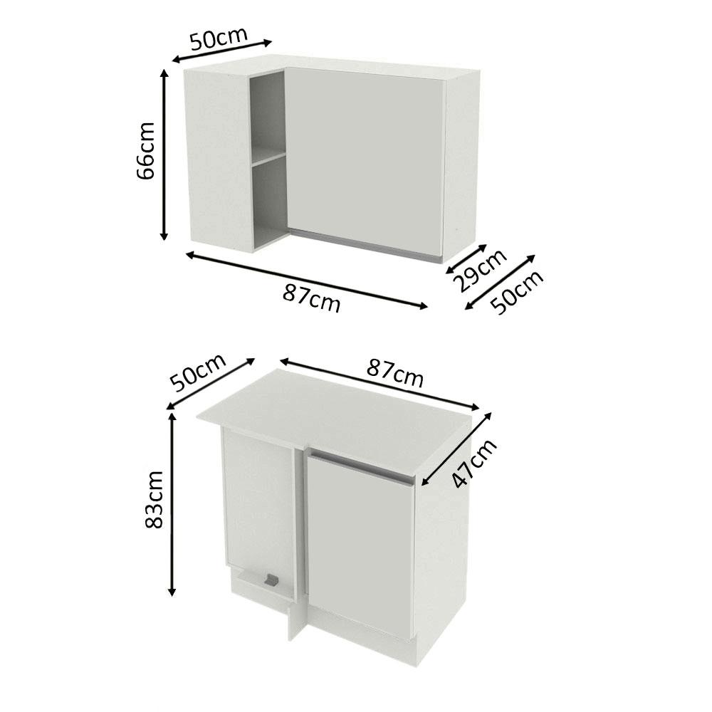 Confira este Kit de Canto da linha Smart da Madesa, que contempla um balcão e um armário aéreo com nicho agregado.O móvel é feito com 100% MDF, um material eco amigável que oferece durabilidade e resistência. Possui puxadores de alumínio, dobradiças metálicas e um rodapé encaixado com pés em PVC ajustáveis em altura. Conta com design de canto reto para otimizar o espaço interno e a utilização do ambiente, sendo montável tanto à direita quanto à esquerda. Além disso, inclui tampo para o balcão. O acabamento branco é feito com revestimento em Pintura Poliéster, que proporciona alta durabilidade e facilidade para a limpeza.Medidas do Balcão: 83 cm de altura x 87 cm de largura x 50 cm de profundidade.Medidas do Aéreo: com 66 cm de altura x 87 cm de largura x 50 cm de profundidade.Itens inclusos: - Um (1) Balcão com uma (1) porta e tampo- Um (1) Aéreo com uma (1) porta e nichoCódigo do produto: XMGCSM13800109 XMGCSM138001A9Obs.: - Imagens meramente ilustrativas. Eletros e decoração não estão inclusos.- A profundidade já está ajustada para o canto- A Madesa não disponibiliza serviço de montagem- O produto acompanha manual e as ferragens necessárias para a instalação1 – O produto vem montado? Se não, vocês realizam a montagem?R.: A Madesa não disponibiliza serviço de montagem. Todos os produtos seguem com manual de instalação e as ferragens necessárias. Alguns produtos possuem vídeo explicando o passo a passo da montagem.2 – Vocês possuem loja física? Posso retirar meu produto em mãos?R.: Não possuímos loja física, apenas loja virtual. Confira as opções de envio ao colocar o seu CEP.3 – Qual é o valor do envio? Posso pagar separadamente?R.: O valor do envio é calculado com base no peso e volume do produto, e no CEP de destino. Você pode calcular o valor e prazo de entrega no simulador.4 – A Madesa entrega em todo Brasil? Como é feita a entrega?R.: Sim, entregamos no Brasil inteiro através de transportadoras parceiras.A Madesa se dedica à sustentabilidade com várias iniciativas: temos uma usina própria para gerar energia que abastece uma de nossas fábricas. Selecionamos nossos fornecedores, priorizando aqueles que possuem um compromisso com a sustentabilidade e proteção do meio ambiente. Todo o plástico utilizado no setor produtivo é proveniente de reciclagem e as suas sobras são encaminhadas ao fornecedor que os recicla. Também investimos no desenvolvimento contínuo de nossos colaboradores e em ações educacionais que beneficiem a comunidade.