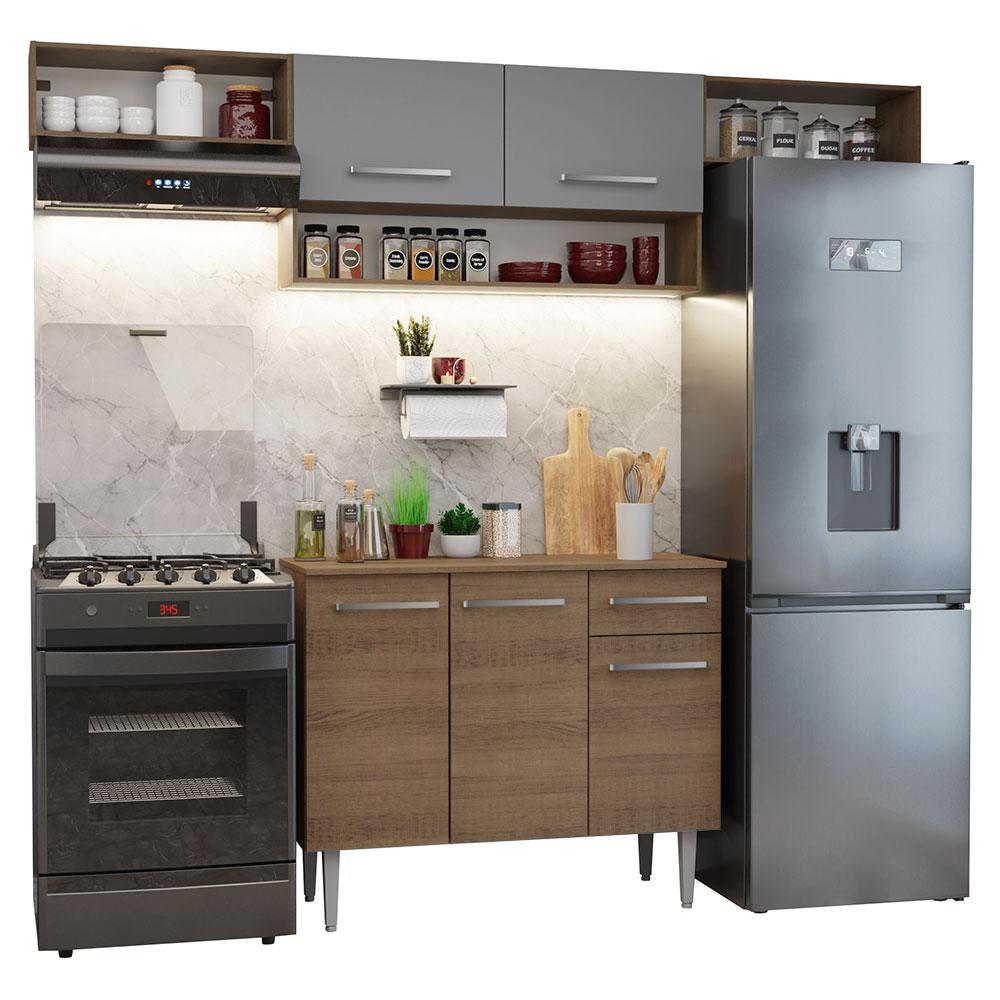 A cozinha Emilly combina funcionalidade e praticidade, otimizando o espaço e facilitando a rotina.Entre os diferenciais estão o acabamento de alta resistência, que garante maior durabilidade, os puxadores em alumínio, além das dobradiças e corrediças metálicas, que proporcionam mais firmeza no uso. Os pés reguláveis completam o conjunto, garantindo mais estabilidade e facilitando a limpeza do ambiente.Para garantir melhor aproveitamento do espaço você pode acomodar fogão e geladeira abaixo dos nichos abertos das laterais, tranzendo ainda mais funcionalidade para sua cozinha. A combinação do amadeirado Rustic com o cinza traz um visual moderno.Medidas totais:- 210 cm de altura- 225 cm de largura- 44 cm de profundidade no balcão e 27 cm nos aéreosInformações técnicas:- Material: MDP- Peso suportado: 69kg- Altura dos pés: reguláveis de 20cm a 21cmO que você recebe:- Um Balcão de 105cm (Acompanha tampo)- Um Aéreo de 225cmCódigo do produto: GREM225001N8É importante saber:- Imagens meramente ilustrativas, a decoração não acompanha o produto.- A Madesa não oferece serviço de montagem.- O produto segue com manual e todas as ferragens necessárias.A Madesa possui compromisso com a sustentabilidade. Geramos energia limpa em nossa própria usina, priorizamos fornecedores responsáveis e utilizamos plástico reciclado em nossa produção. Além disso, reinserimos sobras no ciclo de reciclagem e investimos no desenvolvimento de nossos colaboradores e da comunidade.Garantia: Este produto conta com 1 ano de garantia total, sendo 3 meses de garantia legal e 9 meses de garantia contratual. A garantia cobre exclusivamente defeitos de fabricação e vícios ocultos. Não estão cobertos: problemas decorrentes de montagem incorreta, uso inadequado, exposição à umidade, calor ou luz solar direta, modificações no produto ou desgaste natural.