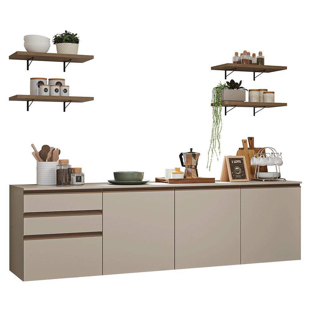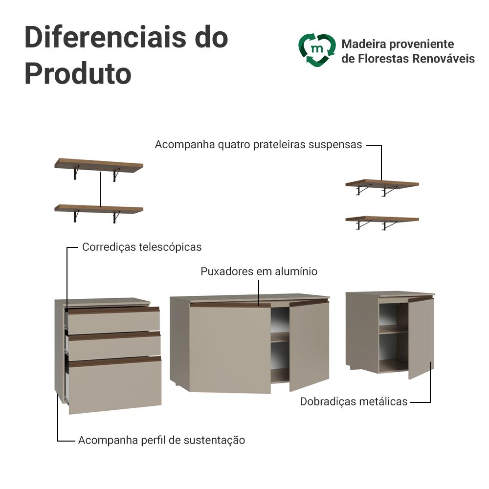 Uma cozinha funcional, moderna e pensada para deixar a rotina mais organizada.Composta por três balcões com ótimo espaço interno, ideais para organizar utensílios ou panelas. Na parte superior, conta com quatro prateleiras abertas, perfeitas para itens decorativos ou deixar objetos de uso frequente sempre à mão.A linha Nice se diferencia por ser suspensa, acompanhando ferragens para fixação. Os balcões já acompanham tampo, proporcionando ainda mais praticidade. Possui corrediças que proporcionam abertura total das gavetas. Medidas totais:- 68 cm de altura- 240 cm de largura- 52 cm de profundidade nos balcões e 31 cm nas prateleirasInformações técnicas:- Material: MDP- Peso total suportado: 193 kgO que você recebe:- Um Balcão de 120cm- Dois Balcões de 60cm- Quatro Prateleiras de 60cmCódigo do produto:XMGRNC2400103BXMGRNC2400107PÉ importante saber:- Imagens meramente ilustrativas, a decoração não acompanha o produto- A Madesa não disponibiliza serviço de montagem- O produto segue com manual de instalação e todas as ferragens necessárias para sua montagemA Madesa possui compromisso com a sustentabilidade. Geramos energia limpa em nossa própria usina, priorizamos fornecedores responsáveis e utilizamos plástico reciclado em nossa produção. Além disso, reinserimos sobras no ciclo de reciclagem e investimos no desenvolvimento de nossos colaboradores e da comunidade.Garantia: Este produto conta com 1 ano de garantia total, sendo 3 meses de garantia legal e 9 meses de garantia contratual. A garantia cobre exclusivamente defeitos de fabricação e vícios ocultos. Não estão cobertos: problemas decorrentes de montagem incorreta, uso inadequado, exposição à umidade, calor ou luz solar direta, modificações no produto ou desgaste natural.
