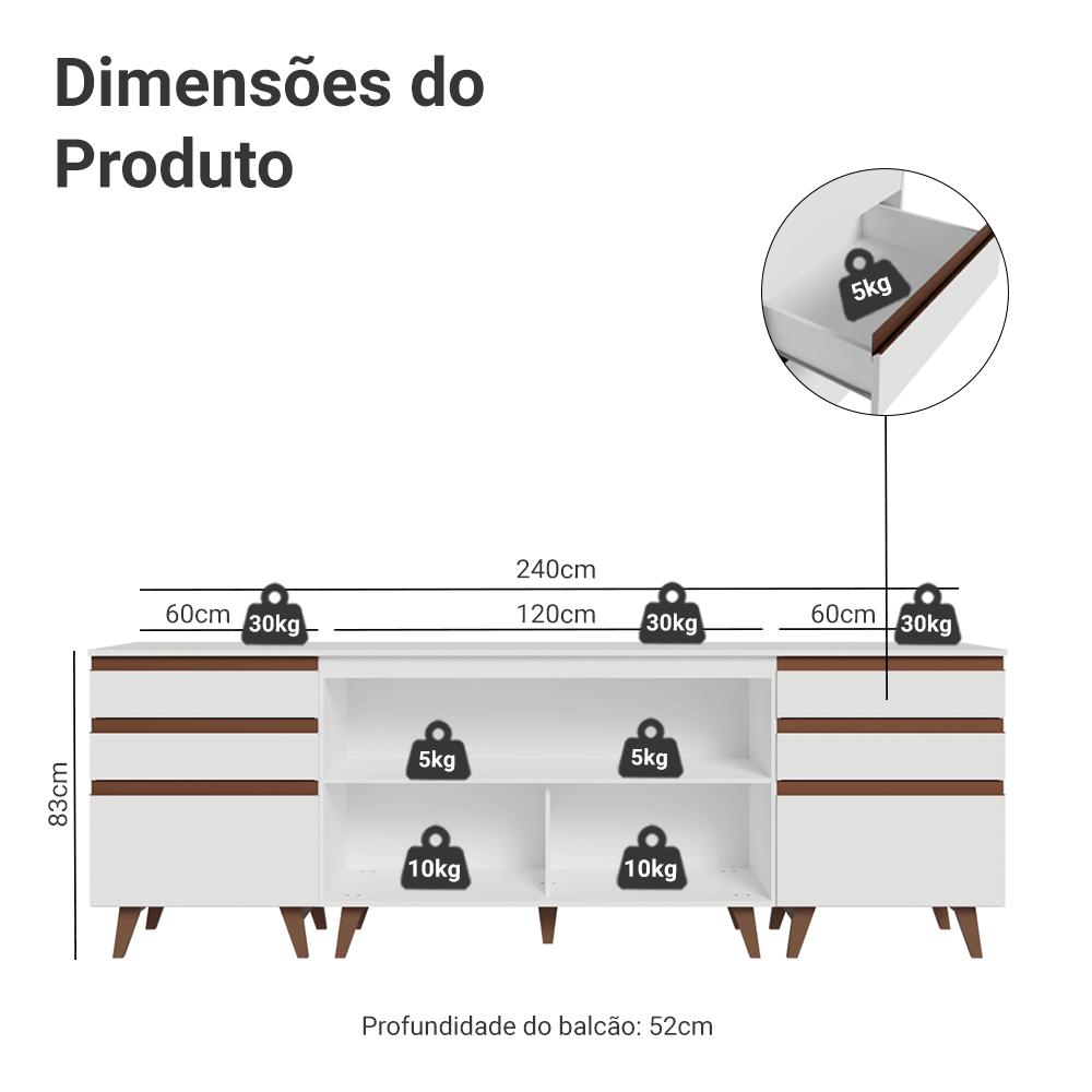 O Kit de Balcões Reims da Madesa é perfeito para quem busca aliar praticidade e estilo na organização da cozinha. Composto por um balcão de 120 cm com duas portas e dois balcões de 60cm com três gavetas em cada, oferecendo ótimo aproveitamento do espaço.Com design retrô, a linha Reims se destaca pelos pés em madeira maciça no estilo palito e pelo acabamento sofisticado. Entre os diferenciais estão os puxadores, dobradiças e corrediças metálicas. Além disso, possui tampo removível, podendo instalar pedra ou cooktop, conforme sua necessidade.Fabricado em MDP de alta qualidade, o kit une durabilidade, beleza e personalidade para transformar sua cozinha em um ambiente funcional e cheio de personalidade.Medidas totais:- 83 cm de altura- 240 cm de largura- 52 cm de profundidadeItens inclusos:- Dois (2) Balcões de 60 cm com três (3) gavetas e tampo- Um (1) Balcão de 120 cm com duas (2) portas e tampoCódigo do produto: XMGRRM24000309XMGRRM2400038NObs.:- Imagens meramente ilustrativas, a decoração não acompanha o produto- A Madesa não disponibiliza serviço de montagem- O produto segue com manual e todas as ferragens necessárias para a instalaçãoA Madesa se dedica à sustentabilidade com várias iniciativas: temos uma usina própria para gerar energia que abastece uma de nossas fábricas. Selecionamos nossos fornecedores, priorizando aqueles que possuem um compromisso com a sustentabilidade e proteção do meio ambiente. Todo o plástico utilizado no setor produtivo é proveniente de reciclagem e as suas sobras são encaminhadas ao fornecedor que os recicla. Também investimos no desenvolvimento contínuo de nossos colaboradores e em ações educacionais que beneficiem a comunidade.