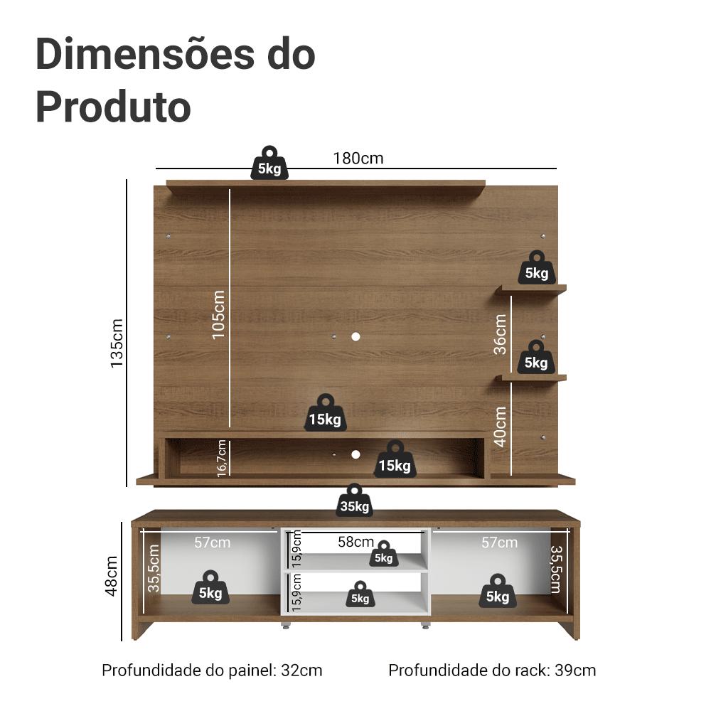 O Conjunto de Rack e Painel para TV Metz da Madesa combina funcionalidade e visual elegante para transformar sua sala de estar.O Painel comporta TVs de até 60 polegadas. Conta com prateleiras e nicho para acomodar o que você quiser. Possui espaço para passagem de fios e cabos, ajudando a manter tudo organizado. Complementando com o Rack Metz, que também oferece excelente espaço interno.O conjunto se destaca pelo acabamento de alta resistência, conservando a beleza do móvel por muito mais tempoMedidas do Painel:- 135 cm de altura- 180 cm de largura- 32 cm de profundidadeMedidas do Rack:- 48 cm de altura- 180 cm de largura- 39 cm de profundidadeInformações técnicas:- Material: MDP- Peso suportado: 100 kgO que você recebe:- Um Painel para TV de até 60 Polegadas- Um Rack de 180 cm de larguraCódigo do produto:XMMDES020043J5XMMDES020043D9É importante saber:- Imagens meramente ilustrativas, a decoração não acompanha o produto.- A Madesa não oferece serviço de montagem- O produto segue com manual e todas as ferragens necessárias.A Madesa possui compromisso com a sustentabilidade. Geramos energia limpa em nossa própria usina, priorizamos fornecedores responsáveis e utilizamos plástico reciclado em nossa produção. Além disso, reinserimos sobras no ciclo de reciclagem e investimos no desenvolvimento de nossos colaboradores e da comunidade.Garantia: Este produto conta com 1 ano de garantia total, sendo 3 meses de garantia legal e 9 meses de garantia contratual. A garantia cobre exclusivamente defeitos de fabricação e vícios ocultos. Não estão cobertos: problemas decorrentes de montagem incorreta, uso inadequado, exposição à umidade, calor ou luz solar direta, modificações no produto ou desgaste natural.