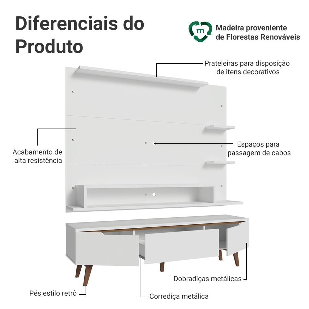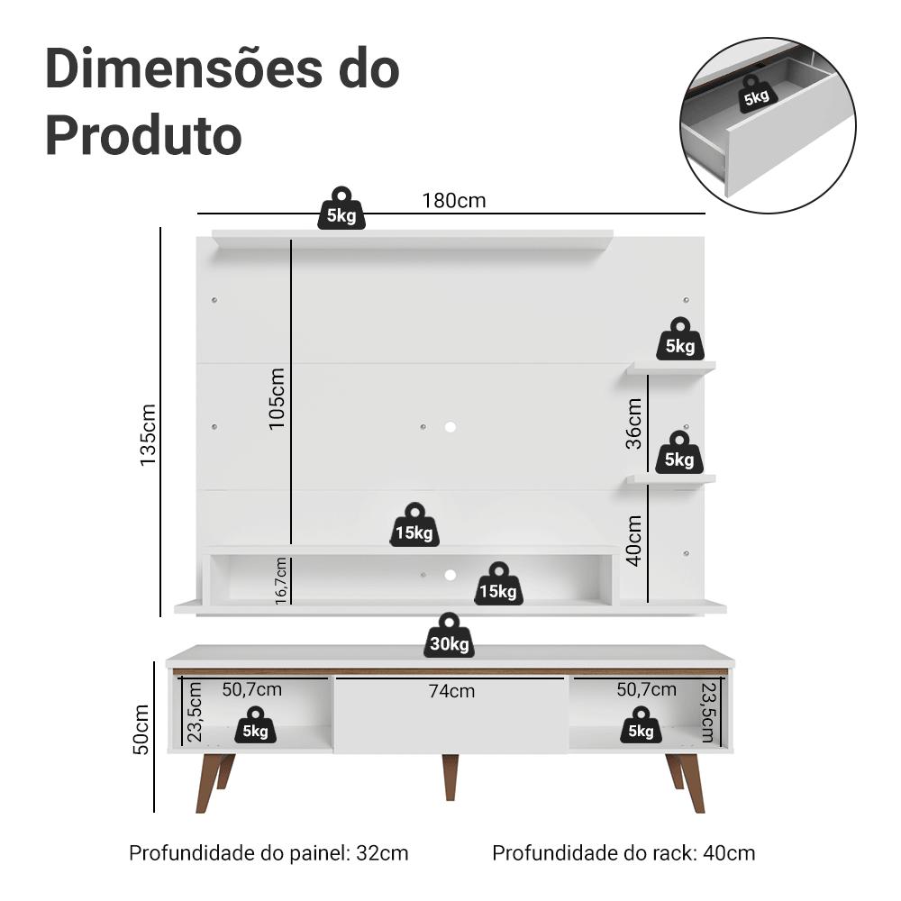 O Conjunto de Rack e Painel para TV Reims da Madesa é a escolha ideal para compor ambientes modernos e elegantes.O Painel para TV comporta TVs de até 60 polegadas. Possui espaço para passagem de fios e cabos, ajudando a manter tudo organizado. O Rack oferece excelente espaço interno. Possui duas portas laterais e uma gaveta central com corrediças metálicas, perfeitas para guardar objetos de forma prática.O destaque fica por conta dos pés em madeira maciça no tom marrom, que garantem melhor sustentação, o acabamento de alta resistência traz leveza e elegância ao conjunto.Medidas do Painel:- 135 cm de altura- 180 cm de largura- 32 cm de profundidadeMedidas do Rack:- 50 cm de altura- 180 cm de largura- 40 cm de profundidadeInformações técnicas:- Material: MDP- Peso suportado: 90 kg- Altura dos pés: 20 cmO que você recebe:- Um Painel para TV de até 60 Polegadas- Um Rack de 180 cm de largura com pésCódigo do produto:XMMDES020044C1XMMDES020044N5XMMDES020044J5É importante saber:- Imagens meramente ilustrativas, a decoração não acompanha o produto.- A Madesa não oferece serviço de montagem- O produto segue com manual e todas as ferragens necessárias.A Madesa possui compromisso com a sustentabilidade. Geramos energia limpa em nossa própria usina, priorizamos fornecedores responsáveis e utilizamos plástico reciclado em nossa produção. Além disso, reinserimos sobras no ciclo de reciclagem e investimos no desenvolvimento de nossos colaboradores e da comunidade.Garantia: Este produto conta com 1 ano de garantia total, sendo 3 meses de garantia legal e 9 meses de garantia contratual. A garantia cobre exclusivamente defeitos de fabricação e vícios ocultos. Não estão cobertos: problemas decorrentes de montagem incorreta, uso inadequado, exposição à umidade, calor ou luz solar direta, modificações no produto ou desgaste natural.