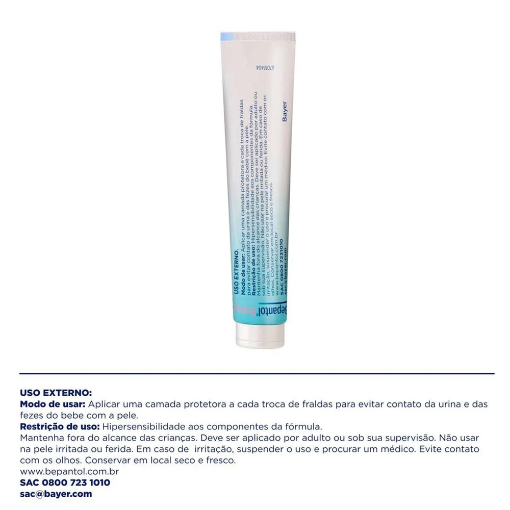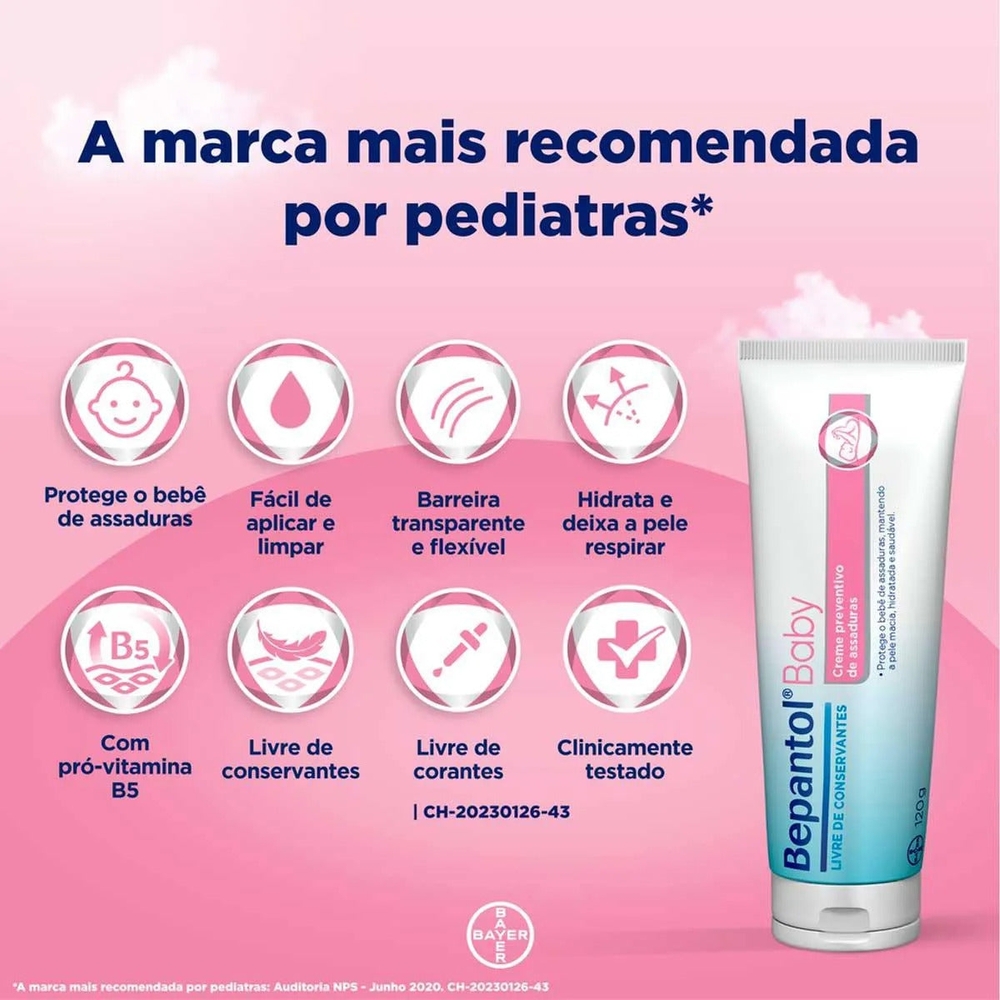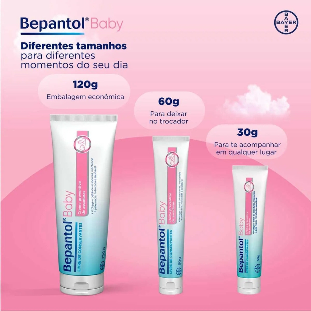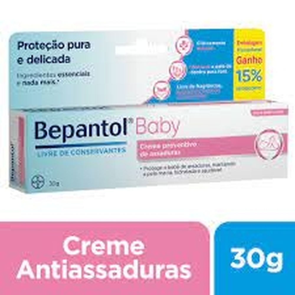 O que é Bepantol Baby? Bepantol Baby é um creme preventivo de assaduras, que também protege a pele do bebê contra vermelhidão e alergias. Sua fórmula conta com Pró-Vitamina B5, que auxilia na restauração da pele do bebê de dentro para fora. Bepantol Baby forma uma camada transparente poderosa, capaz de proteger a pele dos pequenos contra assaduras por até 10 horas. Sem perfume, corantes ou conservantes. Dermatologicamente testado. Para que serve Bepantol Baby? A fórmula de Bepantol Baby é segura e pura e pode ser usada até em bebês recém-nascidos. É muito eficaz na proteção e hidratação, além de auxiliar na restauração natural da pele delicada do bebê. Possui fórmula exclusiva que forma uma camada protetora, promovendo alívio imediato e fortalecendo a defesa natural da pele. Hidrata e deixa a pele do bebê respirar e, além disso, também é fácil de aplicar e limpar. Benefícios Protege o bebê de assaduras. Fácil de aplicar a limpar. Barreira transparente e flexível. Hidrata e deixa a pele respirar. Com Pró-Vitamina B5. Livre de perfume, corantes e conservantes. Dermatologicamente testado. Como usar Bepantol Baby? A cada troca de fraldas, com a pele limpa, aplique uma camada generosa de Bepantol Baby sobre a área a proteger, massageando suavemente. Componentes ativos Vitamina B5; Óleo de Amêndoas; Lanolina; e Dexpantenol. A lista de ingredientes usados na composição pode ser alterada pelo fabricante. Desta forma, recomendamos que você sempre leia a lista de ingredientes na embalagem do produto para garantir que são adequados para seu uso. Advertências Cuidado para o produto não ter contato com os olhos, nariz e boca. Caso haja contato com os olhos, lave-os abundantemente. Uso externo. Não ingerir. Se houver irritação, suspenda o uso imediatamente e procure orientação médica. Mantenha fora do alcance das crianças.