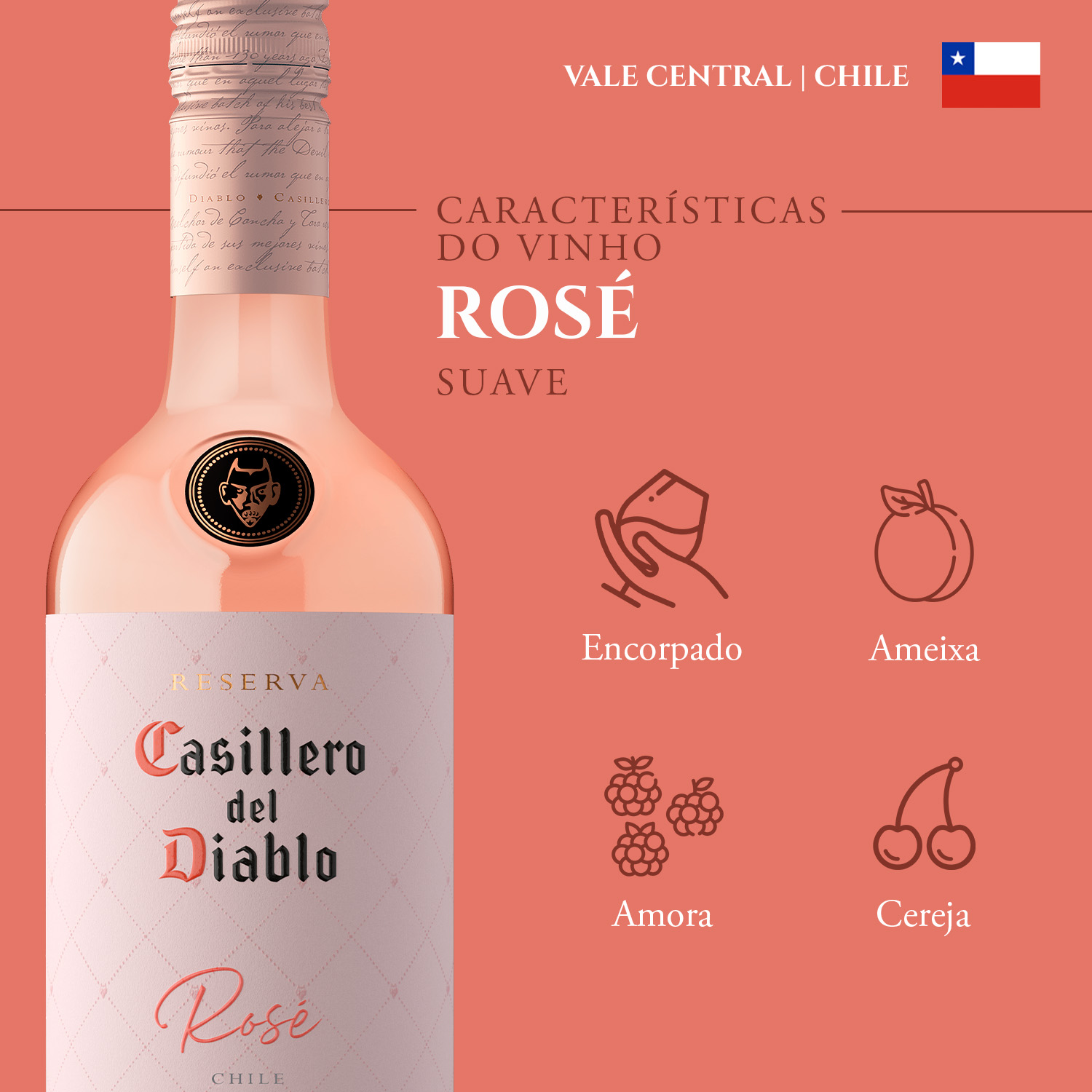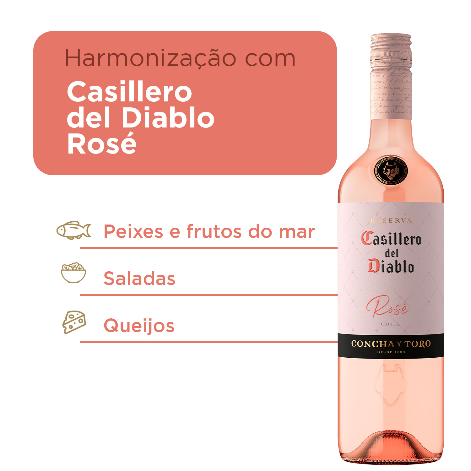 Casillero del Diablo Rosé: suave, fresco e frutadoCom coloração delicada em tom salmão claro, este rosé chileno destaca sua leveza e charme desde o primeiro olhar. No aroma, framboesas, amoras e frutas vermelhas silvestres trazem frescor e intensidade, criando uma experiência olfativa vibrante.No paladar, apresenta corpo médio, acidez agradável e sabores marcantes de ameixa e amora, equilibrando suavidade e sabor em cada gole. Um vinho que conquista pela harmonia e frescor.Casillero del Diablo é um verdadeiro ícone chileno. Reconhecido mundialmente, combina tradição, autenticidade e ousadia para criar vinhos que encantam diferentes gerações.Harmonização perfeita: combina com saladas, peixes, frutos do mar e queijos de acidez suave, como muçarela, trazendo leveza às refeições.Vinho de excelência com Casillero del DiabloFresco, vibrante e elegante, este Vinho Casillero Del Diablo Rosé chileno traz o equilíbrio ideal entre acidez e frutas vermelhas em uma experiência leve e inesquecível.Coloração delicada.Apresenta tom salmão claro, que reforça sua leveza e charme logo ao primeiro olhar.Aromas frutados.Framboesas, amoras e outras frutas vermelhas silvestres trazem frescor e intensidade ao olfato.Paladar equilibrado.Encorpado médio, com acidez agradável e sabores marcantes de ameixa e amoraHarmoniza com leveza.Vai bem com saladas, peixes, frutos do mar e queijos de acidez suave, como a mussarela.A lenda do vinho.Nascido no Chile, Casillero Del Diablo une qualidade e sabores, tornando-se símbolo de autenticidade.Características:- Aroma de framboesas, amoras e outras frutas vermelhas silvestres- Harmoniza com saladas, peixes, frutos do mar e queijosInformações Técnicas:- Volume: 750 ml- Tipo de vinho: Rosé- Origem: Chile