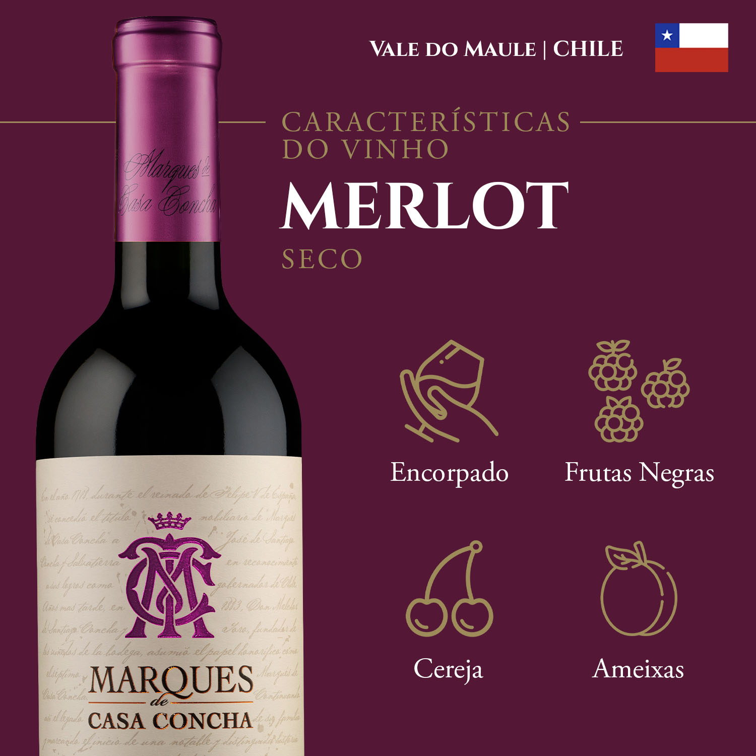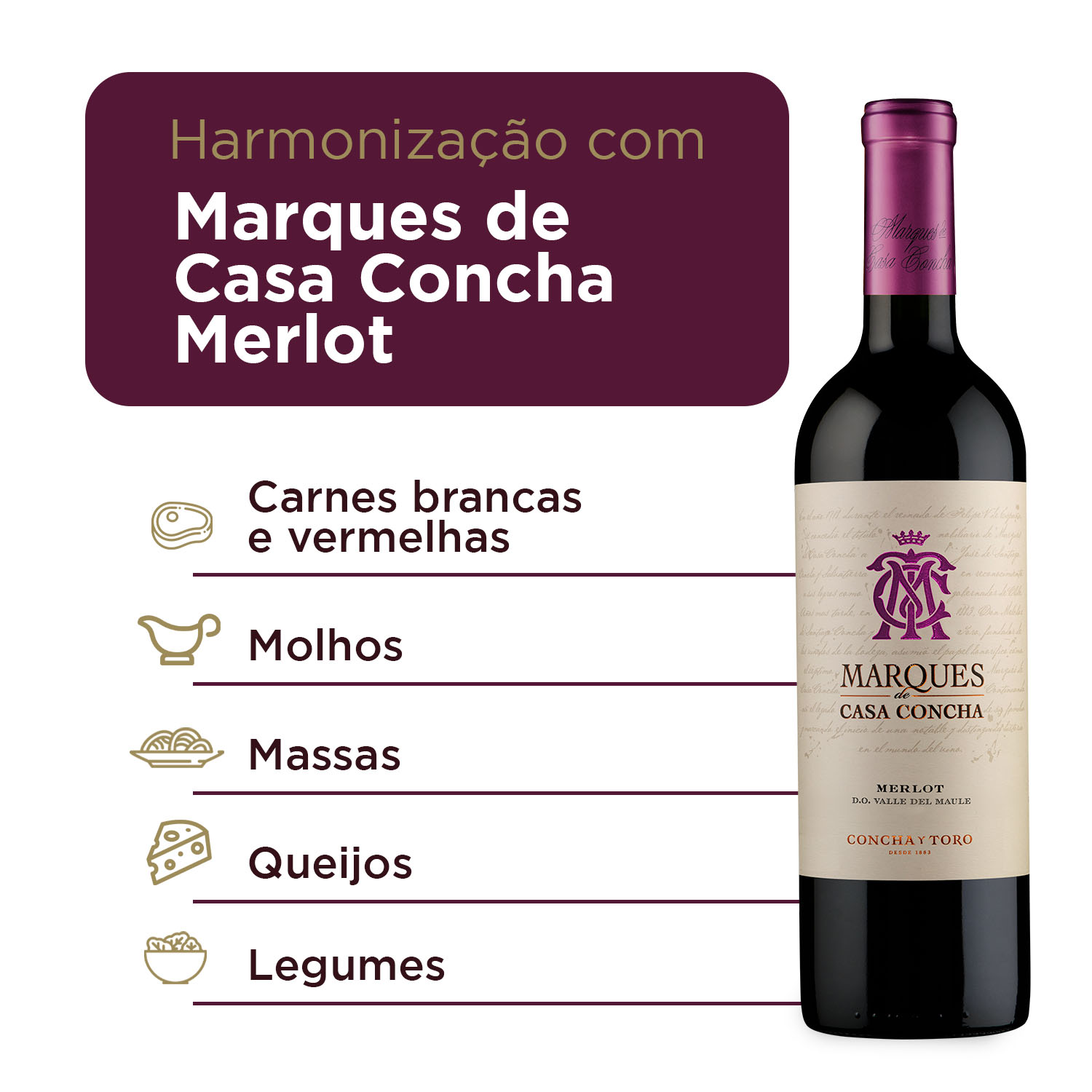 Marques De Casa Concha Merlot: tradição chilena com toques de sofisticaçãoProduzido na tradicional região do Vale do Maule, no Chile, o Marques de Casa Concha Merlot é um vinho que expressa a elegância e a sofisticação típicas dessa uva. Um rótulo que combina tradição e inovação para oferecer uma experiência refinada e marcante.No aroma, revela uma combinação sedutora de frutas negras, ameixas e cerejas, que trazem complexidade e frescor à taça. Em boca, apresenta estrutura suave e taninos delicados, resultado do envelhecimento de 14 meses em barricas de carvalho francês, que confere também notas sutis de madeira e equilíbrio.Assinado pela vinícola Concha y Toro, este vinho expressa tradição, inovação e o compromisso com a qualidade, traduzindo o melhor da elegância chilena em cada gole.Harmonização perfeita: acompanha muito bem carnes variadas e queijos curados, elevando a experiência gastronômica com seu perfil sofisticado e equilibrado.Experimente a excelência Marques De Casa ConchaO Vinho Chileno Marques De Casa Concha Merlot revela toda a sofisticação e equilíbrio que um vinho pode ter. Produzido no tradicional Vale do Maule, apresenta aromas intensos de frutas negras, ameixas e cerejas.A elegância do Merlot.Um vinho chileno de 750 ml que captura a expressão refinada da uva Merlot no Vale do Maule, uma das regiões mais tradicionais do Chile.Aromas sedutores.Combinação harmoniosa de frutas negras, ameixas e cerejas, oferecendo complexidade e frescor.Harmonização versátil.Ideal para acompanhar carnes e uma seleção de queijos curados, elevando a experiência gastronômica.Carvalho com personalidade.Envelhecido de 14 meses em barricas de carvalho francês, revela estrutura suave e sofisticada em cada camada de sabor.Tradição e prestígio.Marques De Casa Concha expressa a tradição, a inovação e a paixão da vinícola Concha y Toro, criando vinhos de alto padrão que traduzem o sabor chileno.Características:- 100% uvas Merlot do Vale do Maule- Aromas de frutas negras, ameixas e cerejas- Taninos suaves e final equilibrado- Harmoniza com carnes e queijosInformações Técnicas:- Volume: 750 ml- Tipo de vinho: Tinto- Uva: Merlot- Origem: Vale Central - Chile
