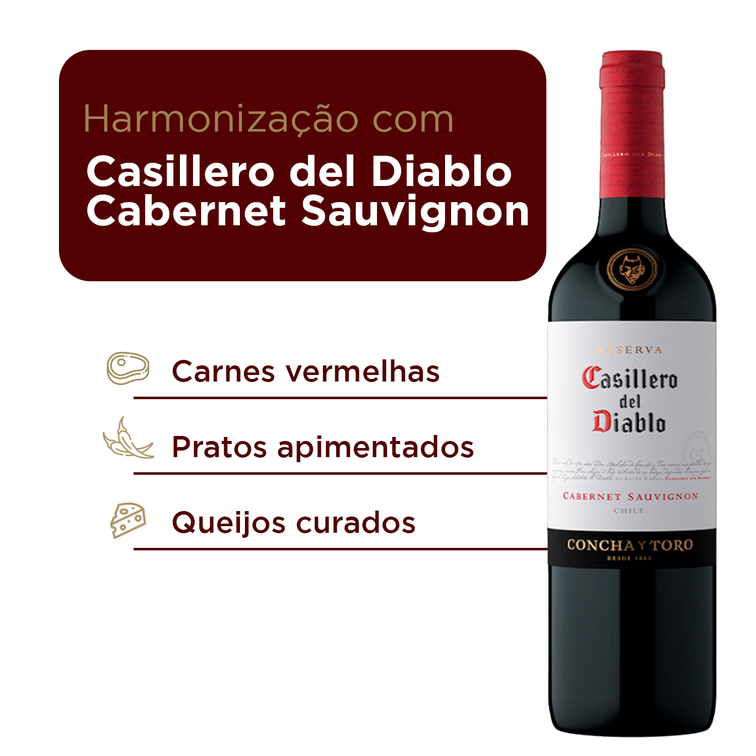 Cabernet Sauvignon: intenso, estruturado e cheio de personalidadeCom coloração vermelho rubi profundo, este Cabernet Sauvignon entrega toda a intensidade e sofisticação dos grandes tintos chilenos. Ideal para momentos especiais com amigos e família ou celebrações a dois.No nariz, destaca-se por aromas expressivos de cereja, groselha negra e ameixa, com um toque elegante de carvalho tostado. Em boca, taninos sedosos e frutas maduras se combinam a um frescor equilibrado, resultando em um paladar envolvente e marcante.Casillero del Diablo é um verdadeiro ícone chileno. Reconhecido mundialmente, combina tradição, autenticidade e ousadia para criar vinhos que encantam diferentes gerações.Harmonização perfeita: carnes vermelhas grelhadas, pratos levemente apimentados e queijos curados revelam todo o potencial deste tinto estruturado.Vinho de excelência com Casillero del DiabloCOR INTENSAVermelho rubi profundo que antecipa a potência e complexidade do vinho.AROMA EXPRESSIVONotas de cereja, groselha negra e ameixa, com um toque de carvalho tostado.PALADAR ENVOLVENTETaninos sedosos, frutas maduras e equilíbrio entre frescor e estrutura.PARA MOMENTOS ROBUSTOSHarmoniza com carnes vermelhas, pratos apimentados e queijos curados.A LENDA DO VINHONascido no Chile, Casillero Del Diablo une qualidade e sabores, tornando-se símbolo de autenticidade.Características:Aroma de cereja, groselha negra e ameixa, com um toque de carvalho tostadoHarmoniza com carnes vermelhas, pratos apimentados e queijos curadosInformações Técnicas:Volume: 750 mlTipo de vinho: TintoUva: Cabernet SauvignonOrigem: Chile - Vale CentralA marca Casillero del Diablo produz vinhos reconhecidos mundialmente e é uma referência da viticultura, além disso possui uma icônica história da adega guardada pelo “diabo”, tornando-se símbolo de exclusividade.