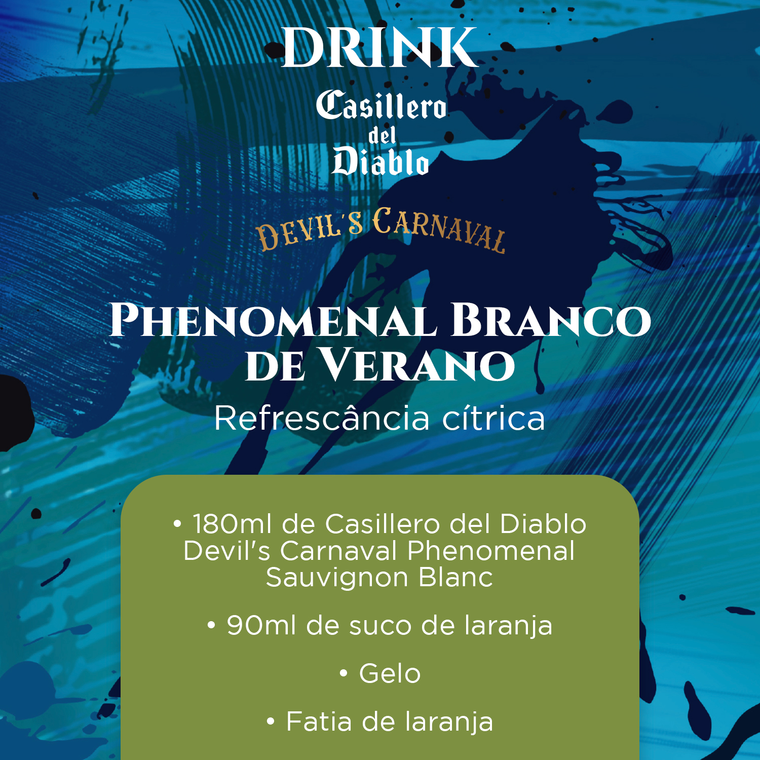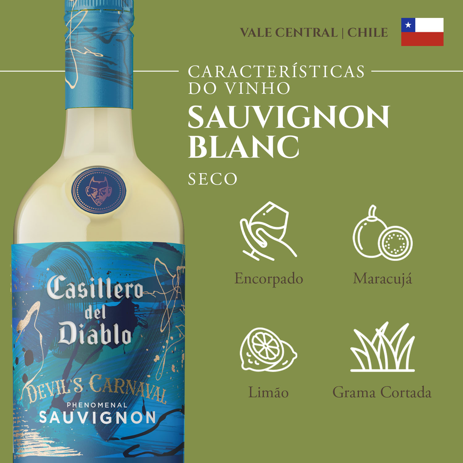 Devil's Carnaval Phenomenal Sauvignon: frescor, leveza e muito saborCom cor clara e brilhante, seus reflexos esverdeados antecipam a leveza e o frescor encantador do Phenomenal Sauvignon, trazendo uma aparência vibrante e convidativa que destaca sua personalidade refrescante.No aroma, notas cítricas e tropicais se combinam harmoniosamente, formando um conjunto fresco e irresistível que desperta os sentidos e convida a um momento de pura apreciação.Casillero del Diablo Devil's Carnaval transforma qualquer ocasião em um brinde inesquecível, perfeito para momentos descontraídos e celebrações especiais entre amigos, onde a alegria e o sabor caminham juntos.Harmonização perfeita: combina especialmente com peixes frescos, frutos do mar e aperitivos fritos, como coxinhas e pastéis, ideal para tardes de verão repletas de sabor e descontração.Descubra o sabor de Casillero del Diablo Devil's CarnavalRefrescante, aromático e surpreendente, este Phenomenal Sauvignon é perfeito para brindar os dias de sol com leveza, sabor marcante e atitude vibrante.Cor clara e brilhante.Possui uma cor clara com reflexos esverdeados, antecipando sua leveza, frescor encantador desse Phenomenal Sauvignon.Aromas tropicais.Conta com notas de frutas cítricas e tropicais que quando combinadas, criam um conjunto aromático fresco e irresistível.Equilíbrio e frescor.A acidez é vibrante, equilibrada e refrescante, proporcionando uma experiência de sabor agradável e deliciosa na boca.Harmoniza com o verão.Ideal com peixes frescos ou aperitivos fritos, como coxinha e pastel para tardes memoráveis e cheias de sabor.Para brindar do seu jeito.Casillero del Diablo Devil's Carnaval transforma qualquer momento em um brinde inesquecível e cheio de personalidade.Características:- Uvas Sauvignon Blanc- Aromas de frutas cítricas e tropicais- Harmoniza com peixes frescos ou aperitivos fritosInformações Técnicas:- Volume: 750 ml- Tipo de vinho: Branco- Uva: Sauvignon Blanc- Origem: Vale Central - Chile