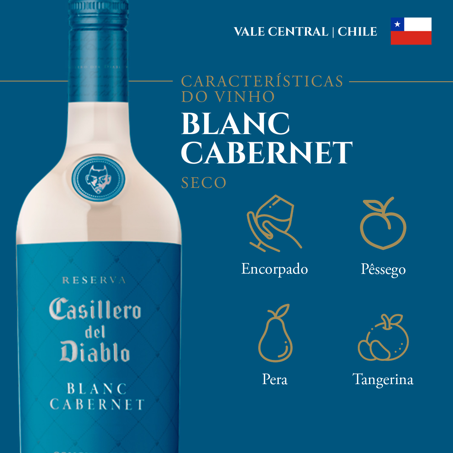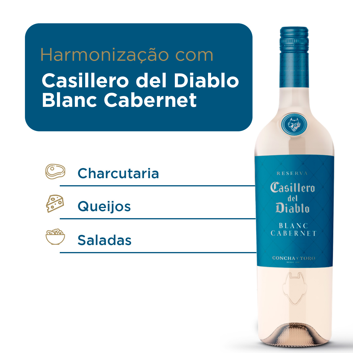 Casillero del Diablo Blanc Cabernet: frescor, leveza e elegância com a alma chilenaElaborado no coração do Vale Central, este Blanc Cabernet expressa uma leitura refrescante e surpreendente da uva. Com cor amarelo-claro brilhante e perfil aromático frutado, encanta desde o primeiro contato com sua leveza, equilíbrio e acidez convidativa. É uma escolha versátil e perfeita para momentos descontraídos.No nariz, revela notas vibrantes de frutas brancas como pera e pêssego, envoltas por um toque cítrico de tangerina. Em boca, é leve e refrescante, com acidez bem equilibrada e final frutado que convida a mais um gole.Casillero del Diablo é um verdadeiro ícone chileno. Reconhecido mundialmente, combina tradição, autenticidade e ousadia para criar vinhos que encantam diferentes gerações.Harmonização perfeita: saladas frescas, queijos leves, embutidos delicados e aperitivos variados.Vinho de excelência com Casillero del DiabloVISUAL DELICADOPossui coloração amarelo claro com brilho sutil, reflexo de sua juventude e frescor.AROMAS FRUTADOSDestaque para frutas brancas frescas como pera e pêssego, com toque cítrico de tangerina.PALADAR SUAVERefrescante, leve e equilibrado, com acidez agradável e final frutado.HARMONIZAÇÃO VERSÁTILIdeal com queijos leves, embutidos delicados, saladas frescas e aperitivos.A LENDA DO VINHONascido no Chile, Casillero Del Diablo une qualidade e sabores, tornando-se símbolo de autenticidade.Características:Aroma de frutas brancas frescas como pera e pêssego, com toque cítrico de tangerinaRefrescante, leve e equilibrado, com acidez agradável e final frutadoHarmoniza com queijos leves, embutidos delicados, saladas frescas e aperitivosInformações Técnicas:Volume: 750 mlTipo de vinho: BrancoUva: Blanc CabernetOrigem: Vale Central - ChileA marca Casillero del Diablo produz vinhos reconhecidos mundialmente e é uma referência da viticultura, além disso possui uma icônica história da adega guardada pelo “diabo”, tornando-se símbolo de exclusividade.