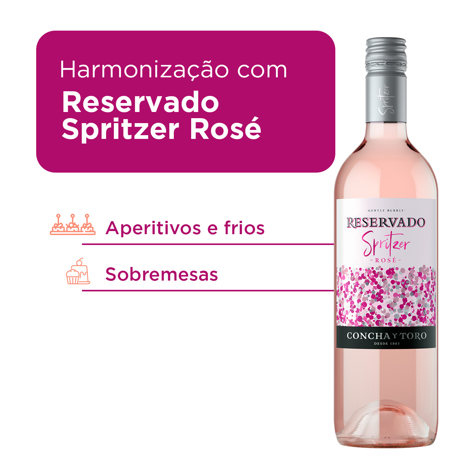 KIT3 UNIDADESUma experiência envolvente Concha y ToroUm Rosé Reservado Spritzer refrescante e delicado, que combina frutas tropicais, leveza e suavidade em uma experiência única.Cor rosada suave.Conta com um tom claro e elegante, que antecipa toda a leveza, sofisticação e frescor delicado do vinho rosé.Aromas tropicais.Notas de abacaxi maduro e banana despertam os sentidos com charme frutado e toques exóticos.Frescor e doçura.No paladar, revela acidez equilibrada e um final suavemente adocicado, que prolonga o sabor na boca.Para momentos doces.Ideal com entradas frias, queijos leves, sobremesas delicadas e também perfeito para degustar sem pressa.Qualidade Concha y Toro.A linha Reservado Spritzer combina frescor, suavidade e o espírito casual em cada gole.Características:- Aromas de abacaxi maduro e banana- Harmoniza com entradas frias, queijos leves e sobremesas delicadasInformações Técnicas:- Volume: 750 ml- Tipo de vinho: Rosé- Uva: Cabernet Sauvignon- Origem: Chile