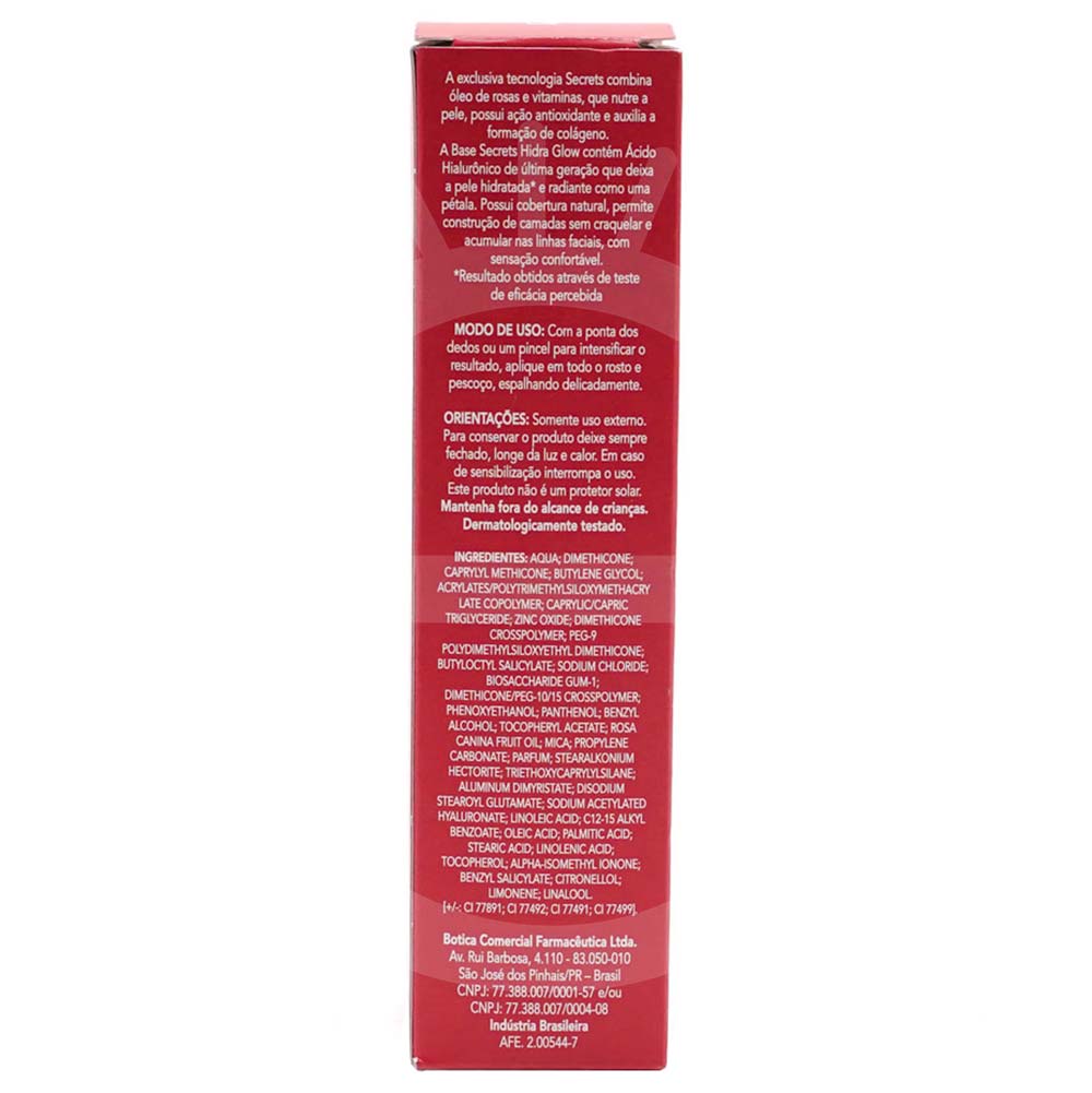 Secrets Base Líquida Hidra Glow Niina Secrets by Eudora: Descubra a Nova Linha Niina Secrets em parceria com Eudora: A exclusiva tecnologia Secrets combina óleo de rosas e vitaminas, que nutre a pele, possui ação antioxidante e auxilia a formação de colágeno. A Base Secrets Hidra Glow contém Ácido Hialurônico de última geração que deixa a pele hidratada* e radiante como uma pétala. Benefícios: Possui cobertura natural, permite construção de camadas sem craquelar e acumular nas linhas faciais, com sensação confortável.* Resultados obtidos através de teste de eficácia percebida. Como usar: Com a ponta dos dedos ou um pincel para intensificar o resultado, aplique em todo o rosto e pescoço a base líquida Hidra Glow, espalhando delicadamente por todo o rosto. Resultados: - Pele Hidratada e Radiante - Tecnologia Secrets - Nutre a pele - Média cobertura: pele com viço natural - 17 tons para você escolher