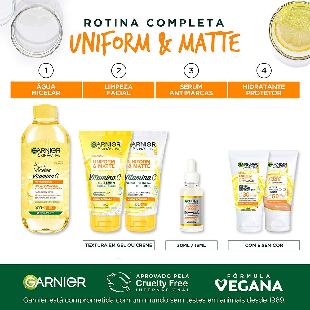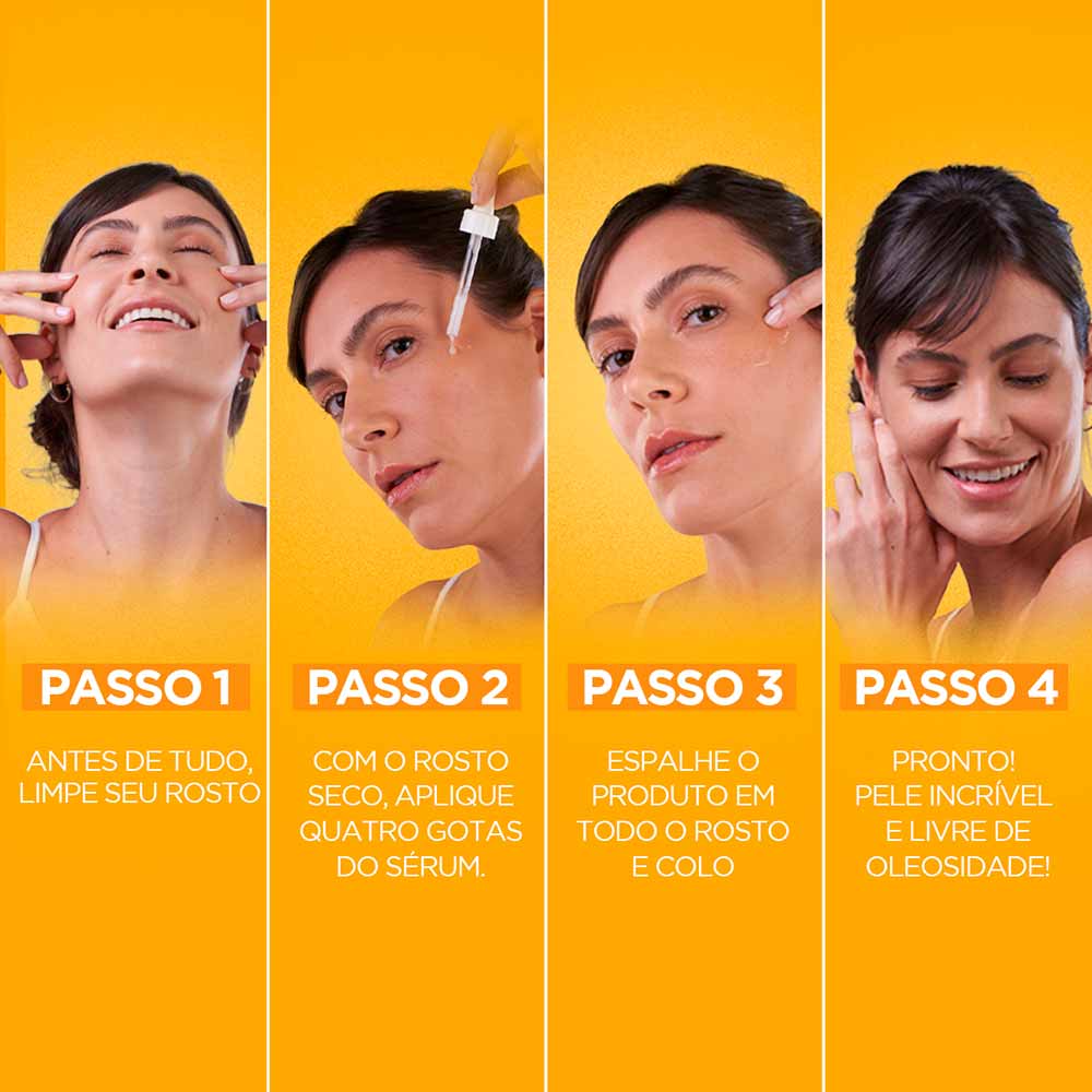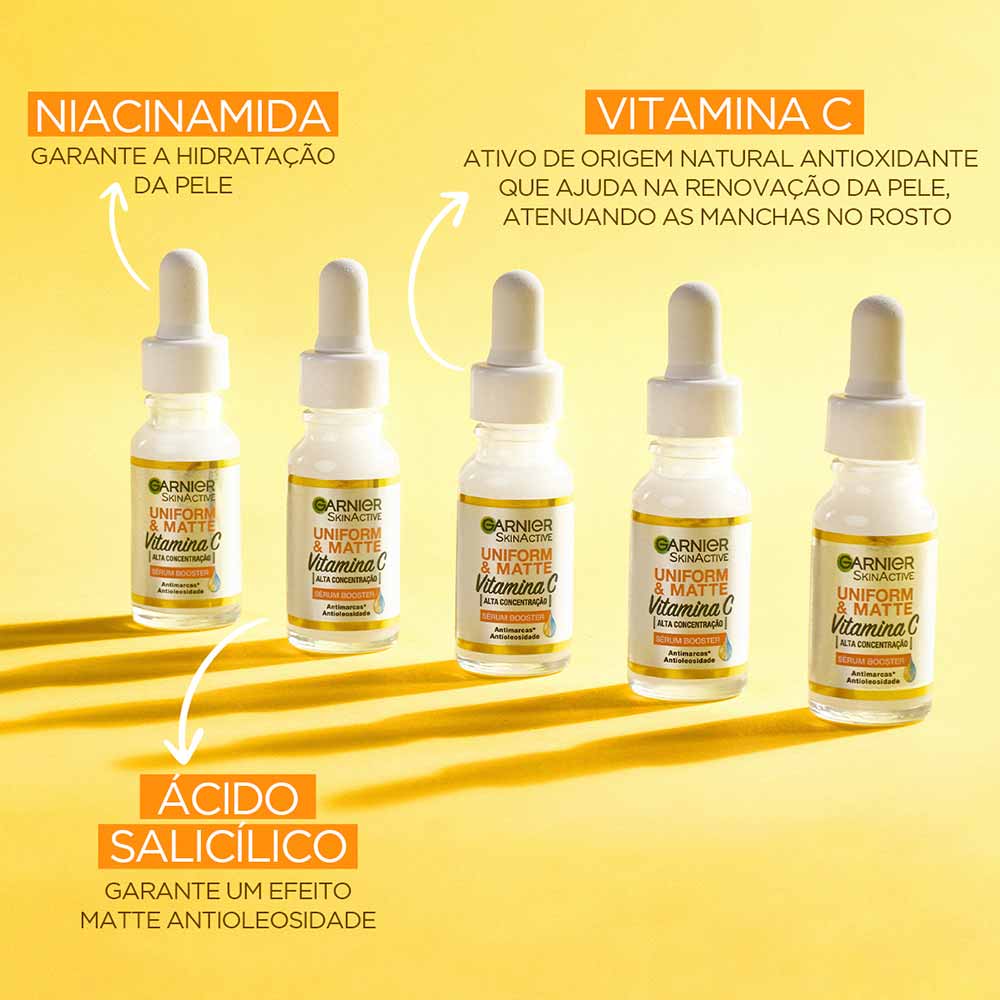 Quer um Efeito Peeling em casa e sem gastar muito? O novo Garnier Uniform & Matte Sérum Booster tem Alta Concentração de Vitamina C, Niacinamida, Ácido Salicílico e Extrato de Limão, que garantem marcas menos visíveis, pele uniformizada e hidratada, sem deixá-la oleosa. A textura sérum garante fácil aplicação, sensação gostosa pós uso e rápida absorção. Resultados comprovados pelas consumidoras: 87% das consumidoras sentiu redução das marcas, 90% sentiu textura não oleosa e 87% sentiu a pele mais uniforme e mais hidratada. Resultados visíveis e comprovados: - Redução de manchas garantida pela ação antioxidante da vitamina C. - Pele com efeito matte, garantido pelo Ácido Salicílico. - Pele hidratada, graças à Niacinamida. Nossa tecnologia: Alta Concentração de Vitamina C: Poderoso antioxidante que reduz marcas, imperfeições e uniformiza a pele. Ácido Salicílico: Garante um efeito matte antioleosidade e uniformização da pele reduzindo a aparência de poros e deixando a pele com um aspecto mais liso. Niacinamida: Hidratação da pele. Aprovado por dermatologistas, para todas nós! Modo de uso: Aplicar de manhã e noite, após limpeza do rosto e antes do hidratante ou protetor. Recomenda-se 4 gotas para cobrir uniformemente rosto e pescoço. Precauções: evite o contorno dos olhos. Em caso de contato direto com os olhos, lavar em abundância com água corrente. Advertência: não aplicar em crianças.