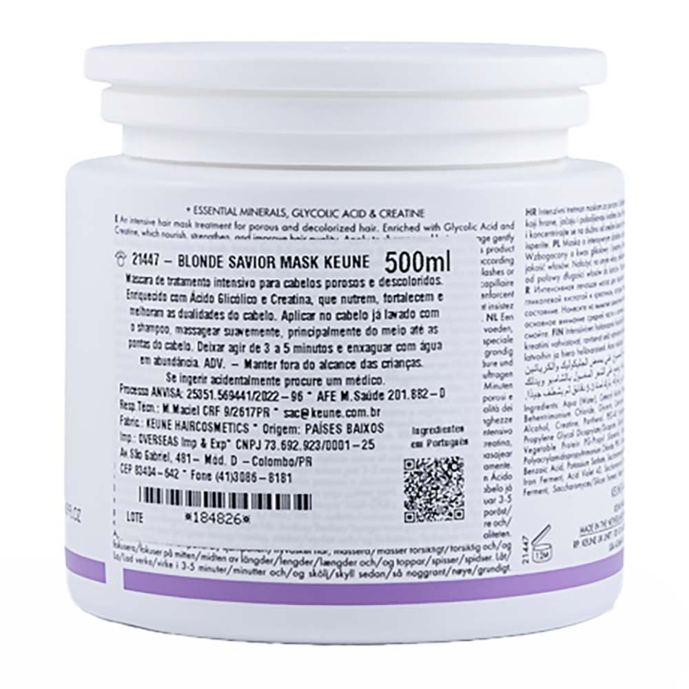 A Máscara Blonde Savior faz parte da linha de tratamento Blonde Savior, desenvolvida especialmente para cabelos sensibilizados, danificados e descoloridos. Assim como nos demais produtos da linha, a máscara conta com Ácido Glicólico e Creatina como ingredientes principais. Enquanto o ácido glicólico atrai água para o fio, mantendo-o hidratado, a Creatina fortalece as ligações dentro do fio de cabelo, recuperando sua saúde e força. Além destes dois ingredientes, a fórmula também conta com Mirasil, um polímero condicionante patenteado, que deixa o cabelo macio e sedoso, e Keravis, um complexo proteico à base de plantas, que fortalece os fios danificados. Dessa forma, a máscara recupera os fios desde o córtex interno, diminuindo as quebras e conferindo hidratação imediata, deixando o cabelo saudável e brilhoso. Com o tratamento completo (shampoo, leave-in e máscara) você garante fios 7x mais fortes, 96% menos quebra e elimina 64% dos danos causados pelo processo de descoloração.