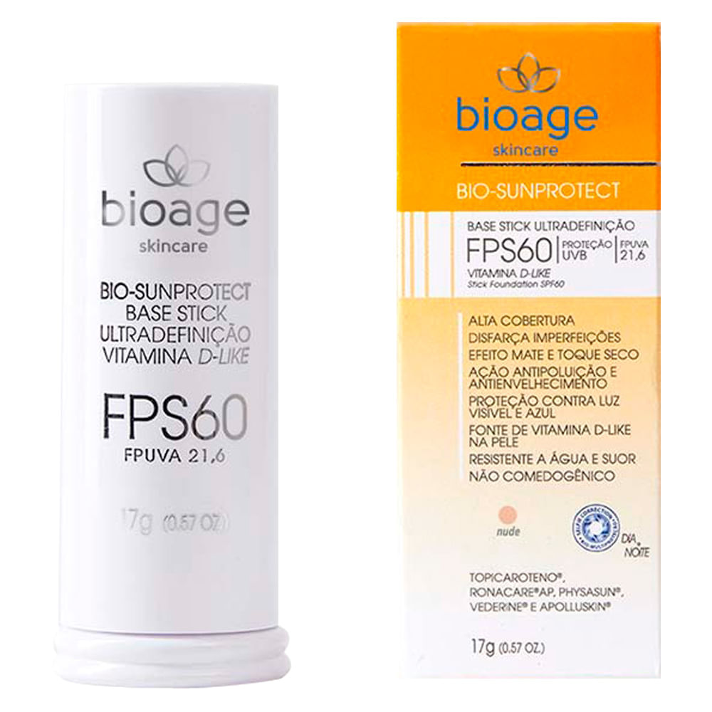 Base Stick de Alta Cobertura, com fator de proteção solar, protege contra UVA/UVB, luz visível, luz IV emitidas também pelos equipamentos eletrônicos. Contém a exclusivaTecnologia Selfie Correction que com seu efeito ultradefinição promove disfarce das imperfeições e total cobertura da pele e a tecnologia Bio-Multiproteção com 24 horas de ação antioxidante. Efeito preenchedor biológico: Somado ao disfarce imediato de imperfeições (rugas, poros abertos etc.). Estimula o colágeno 18 que trabalha na sustentação e repõe a vitamina D like colaborando para um aspecto ainda mais jovial. Benefícios: Protetor solar em base stick Ultra definição com alta cobertura Ação antipoluição e antienvelhecimento Pele uniforme e efeito mate Tipos de pele: Todos os tipos de pele e fototipo I ao IV Quando usar: Diurno Onde usar: Rosto, colo e pescoço Quantas vezes: O produto deve ser aplicado diariamente em quantidade adequada para fazer a cobertura total da pele, recomenda uso associado com o Bio-Sunprotect FPS Pó Compacto para realizar a reaplicação da fotoproteção ao longo do dia. Textura: Bastão/Stick Tecnologia: Tecnologia Selfie Correction e Bio-Multiproteção Claims da Composição: Composto por filtros solares químicos e físicos Protege contra os raios UVA e UVB, luz visível, azul e iv Livre de parabenos Não testado em animais Livre de benzofenona Livre de óleo mineral Sem álcool etílico Dermatologicamente testado