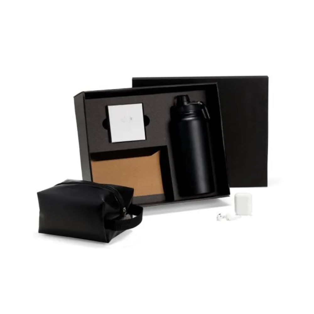 Composto por uma garrafa de inox de dupla camada, um fone Bluetooth e uma necessaire em material sintético, este kit foi pensado para acompanhar você em todas as suas atividades. A garrafa mantém suas bebidas na temperatura ideal por mais tempo, enquanto o fone proporciona liberdade sonora para sua música e chamadas. A necessaire, por sua vez, organiza seus itens essenciais com elegância e praticidade.