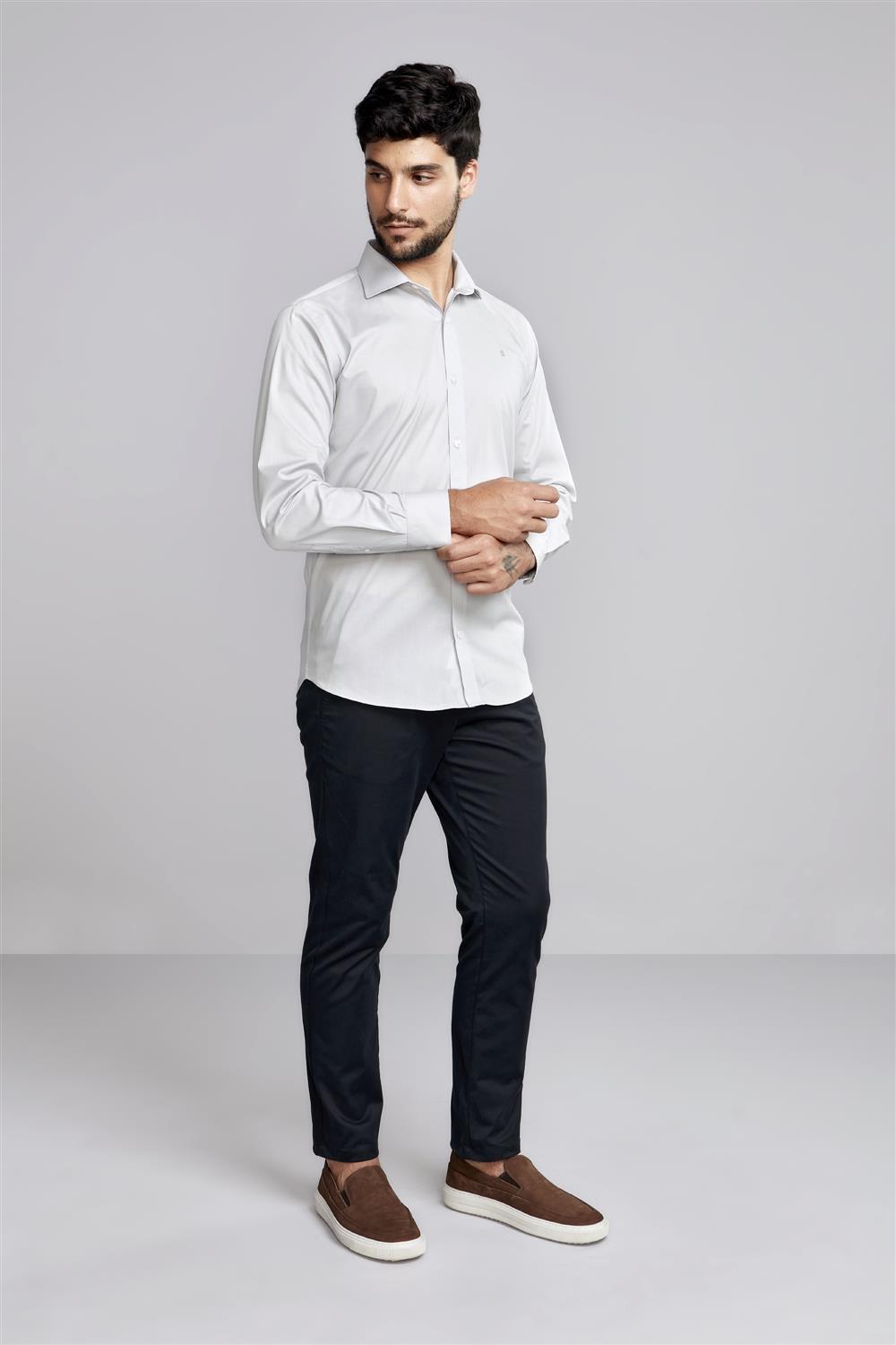 A Camisa Comfort é confeccionado em 97% Algodão e 3% Elastano. O produto é confeccionado com modelagem Comfort, possui corte reto e modelagem mais solta ao corpo, é uma ótima opção para quem busca por leveza e conforto. Possui o colarinho Paris, com 3,5 cm de pé de gola, 7,5 cm de ponta, 14,5 cm abertura e pesponto de 0,3 cm, apropriado para uso de gravatas de nó duplo por possuir abertura maior.