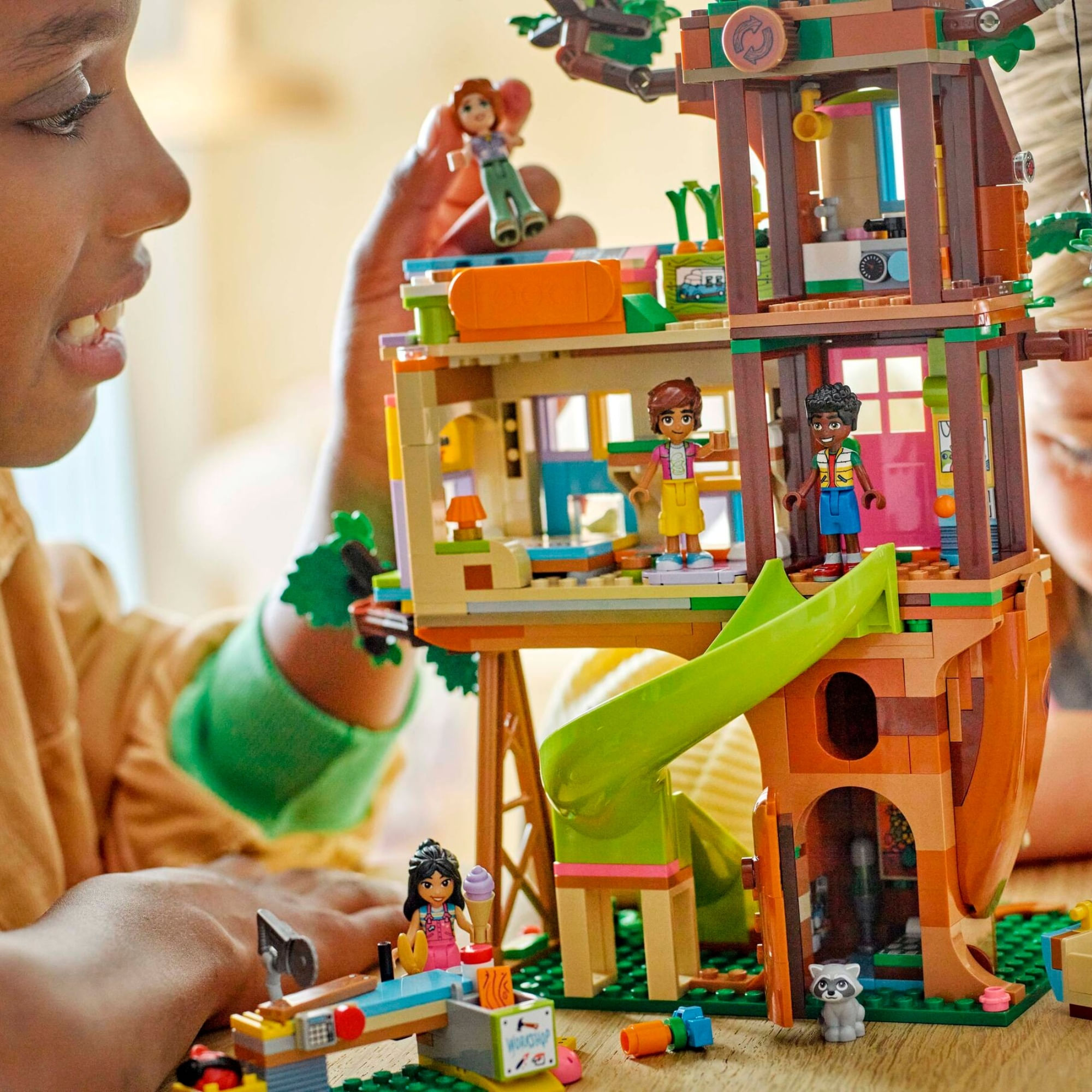 Este conjunto é repleto de histórias divertidas, enquanto os personagens Liann, Autumn, Leo e Zac aproveitam o tempo juntos na casa da árvore que construíram. Há espaços para brincar, cozinhar e dormir, além de uma horta com cenouras para colher. Detalhes doces incluem o elevador que o cachorro Pickle usa e o esconderijo secreto do guaxinim.