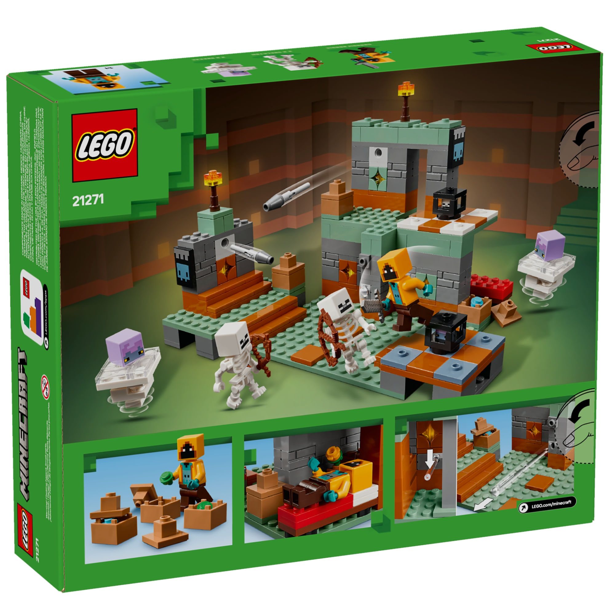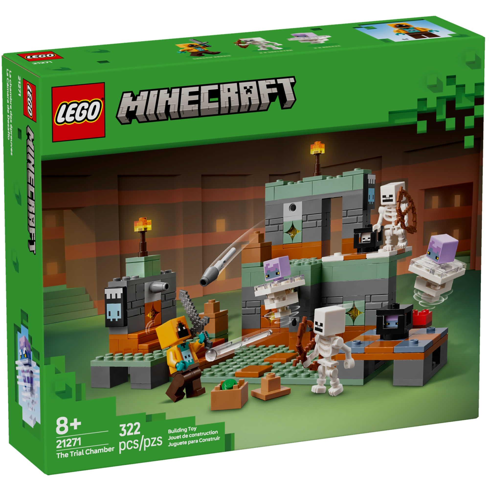 Este brinquedo de construção criativo é ambientado na câmara de teste do Minecraft. Inclui 2 figuras de esqueleto, 2 figuras de brisa, uma minifigura Shadow Hoodie e 2 geradores. Há 2 lançadores de mísseis de disparo rápido – 1 em cada parede – e um míssil de mola com gatilho atrás da parede traseira. 3 potes, cada um escondendo uma esmeralda ou um diamante, contêm o tesouro procurado. Para mais possibilidades de brincadeira, um cômodo na parte de trás do conjunto é equipado com uma cama e uma mesa. Para diversão digital, o aplicativo LEGO Builder permite que as crianças ampliem, girem modelos em 3D e acompanhem seu progresso.