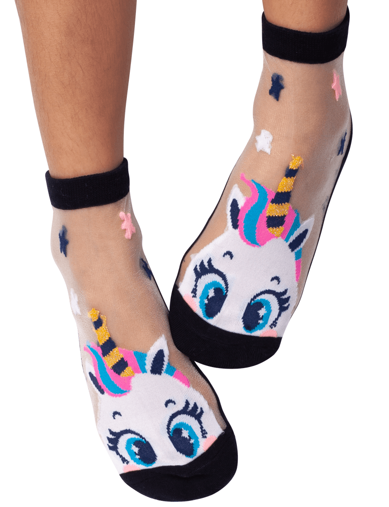 A meia soquete transparente é produzida em fio de poliéster transparente; o fio de poliamida é utilizado nos desenhos de estrelas coloridas e unicórnio divertida, calcanhar, punho e ponteira são em fio de algodão. Instruções de lavagem: Lavagem a mão; Não alvejar. Instruções de conservação: Não secar em tambor; Não passar; Não limpar a seco; (mais informações, vide na etiqueta). Instruções de garantia: Deverá ser encaminhado dentro da embalagem original; Sem indicações de uso; Acompanhado de nota fiscal; E com todos os itens constante na solicitação da compra.