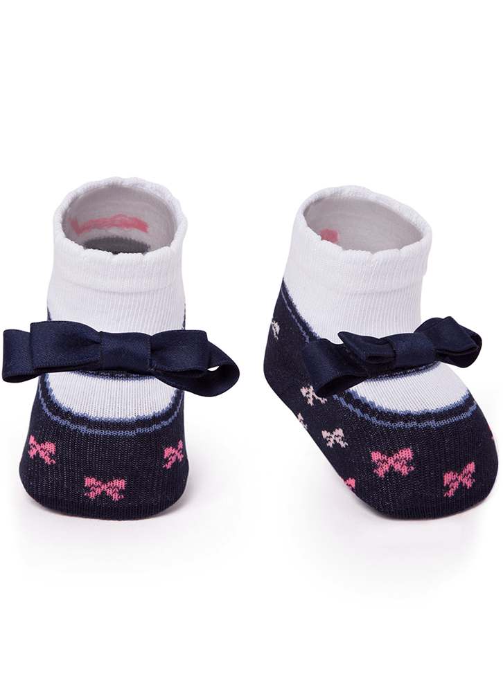 A meia com modelagem soquete é produzida em algodão macio, possui cano confortável, desenhos delicados e aplique de laço.
