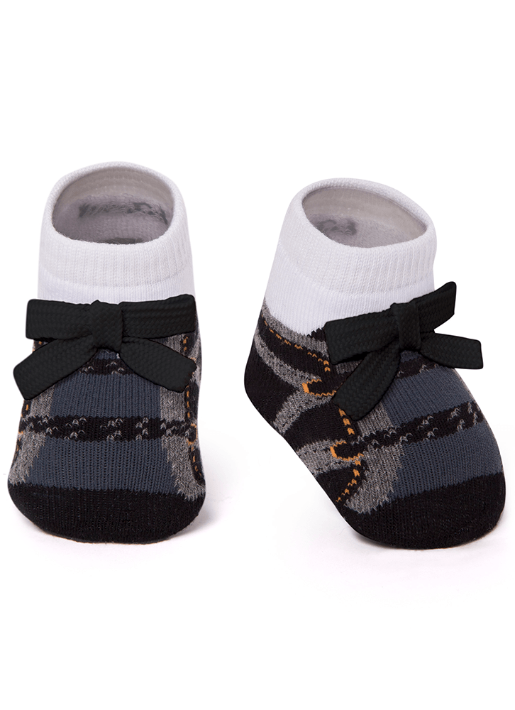 A meia com modelagem soquete é produzida em algodão macio, possui antiderrapante com aroma de bebê, desenho divertido de tênis e aplique de cadarço.