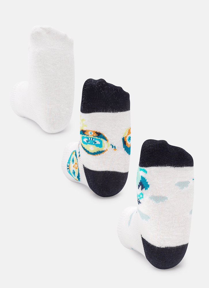 Kit com três pares de meias em algodão macio, sendo duas com desenhos divertidos e uma em cor lisa. Possuem cano confortável de altura média.