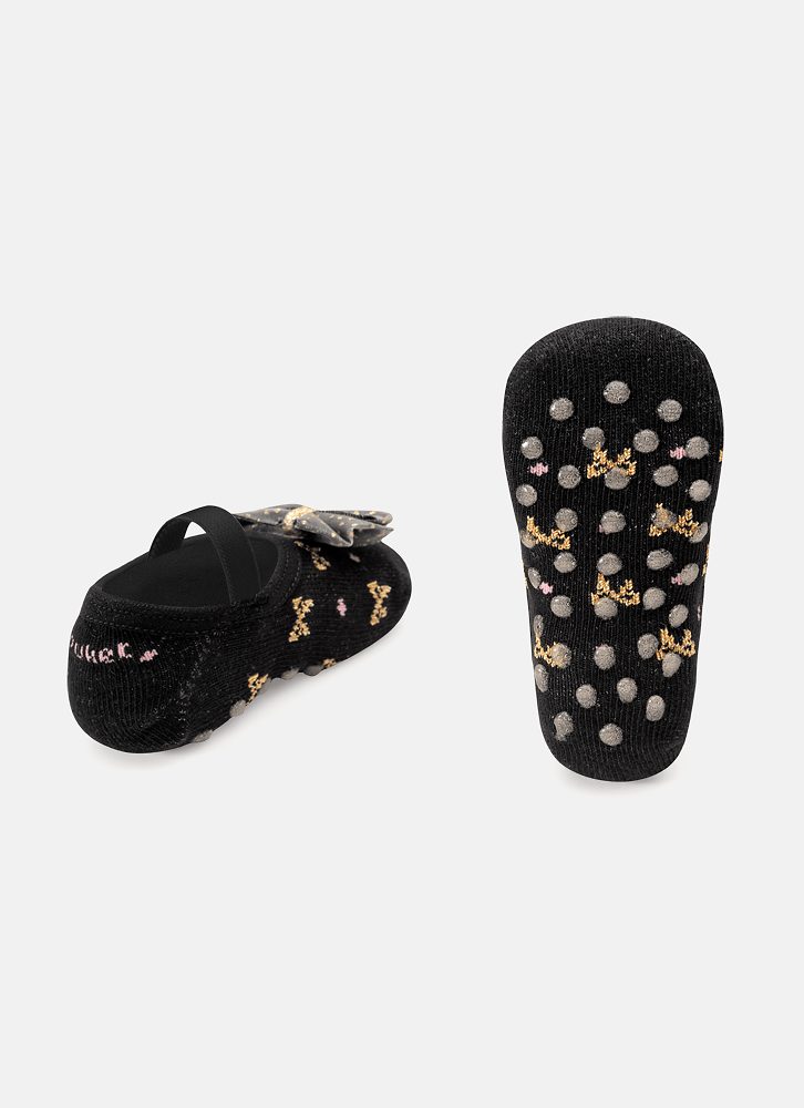 Meia com modelagem de sapatilha desenhada, aplique de laço costurado na frente da meia. Produzida com algodão macio em sua maior parte poliamida, e detalhes com fio de lurex. Possui acabamento em viés e elástico confortável texturizado. Solado com antiderrapante no tamanho 9 á 12 meses com aroma cheirinho de bebê Indicação de uso: Ideal para praticar exercícios e brincadeiras sem o uso do calçado e uso no dia a dia em casa. Instruções de Lavagem: Lavagem a mão Não alvejar Instruções de Conservação: Não secar em tambor Não passar Não limpar a seco (MAIS INFORMAÇÕES, VIDE NA ETIQUETA) Instruções de Garantia: Deverá ser encaminhado dentro na embalagem original ACOMPANHADO DE NOTA FISCAL E com todos os itens constante na solicitação da compra.