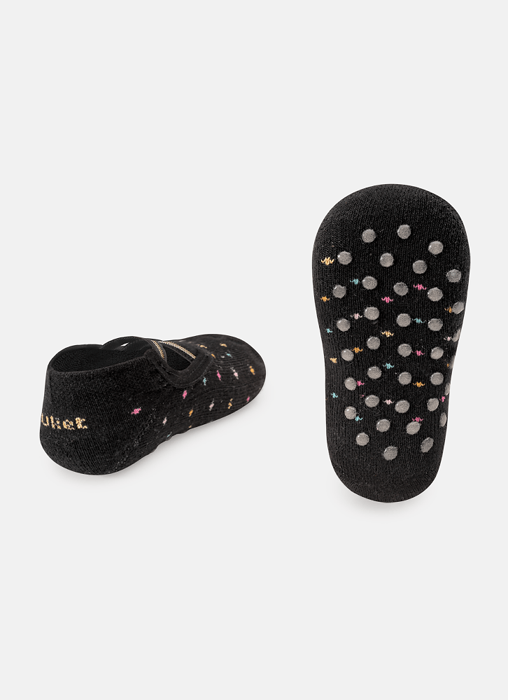 Meia com modelagem de sapatilha ballet , desenho de poá colorido. Produzida com algodão macio em sua maior parte poliamida, e detalhes com fio de lurex. Possui acabamento em viés e elástico confortável com detalhes em lurex. Solado com antiderrapante com aroma cheirinho de bebê. Indicação de uso: Ideal para compor com a roupinha sem o uso do calçado e usar no dia a dia. Instruções de Lavagem: Lavagem a mão Não alvejar Instruções de Conservação: Não secar em tambor Não passar Não limpar a seco (MAIS INFORMAÇÕES, VIDE NA ETIQUETA) Instruções de Garantia: Deverá ser encaminhado dentro na embalagem original ACOMPANHADO DE NOTA FISCAL E com todos os itens constante na solicitação da compra.