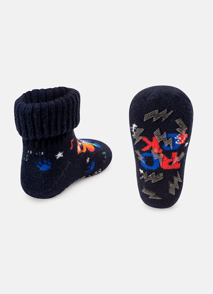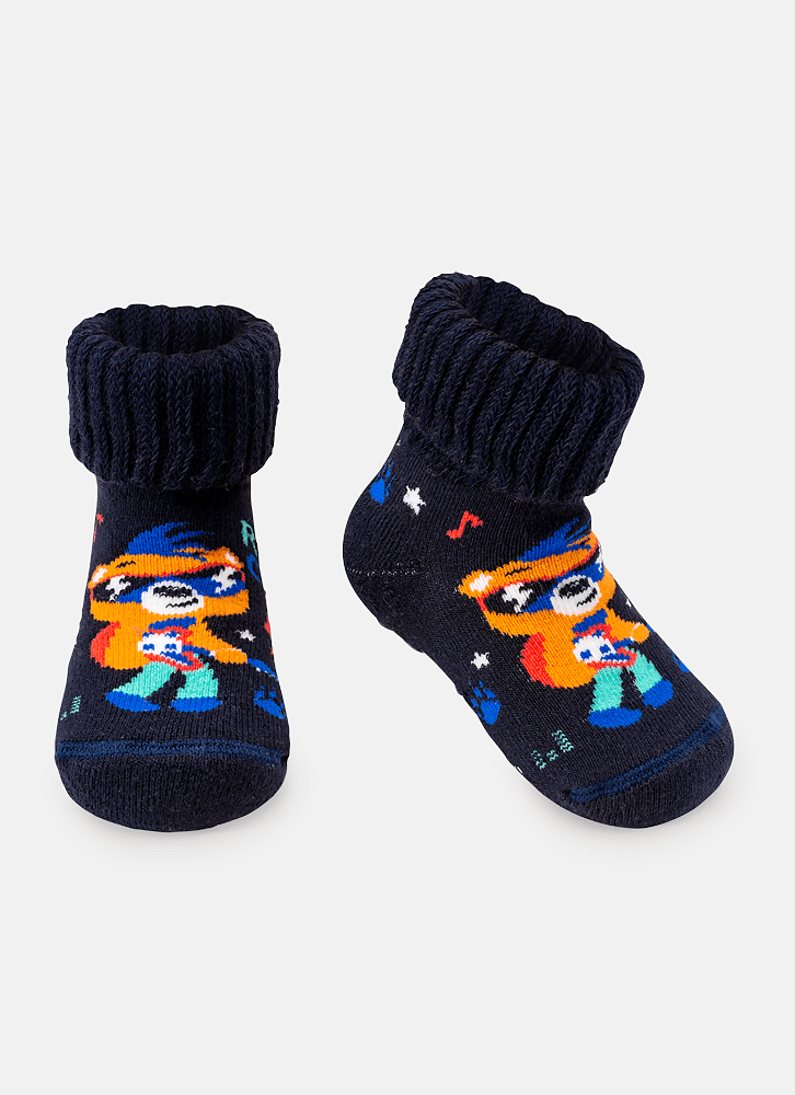A meia com modelagem de botinha atoalhada com desenho do Urso rock Produzida com algodão macio em sua maior parte poliamida. Com o punho em rib super confortável que pode ser usada dobrada ou não. Possui antiderrapante com aroma cheirinho de bebê Indicação de uso: Ideal para praticar brincadeiras sem o calçado e uso no dia a dia. Instruções de Lavagem: Lavagem a mão Não alvejar Instruções de Conservação: Não secar em tambor Não passar Não limpar a seco (MAIS INFORMAÇÕES, VIDE NA ETIQUETA) Instruções de Garantia: Deverá ser encaminhado dentro na embalagem original ACOMPANHADO DE NOTA FISCAL E com todos os itens constante na solicitação da compra.