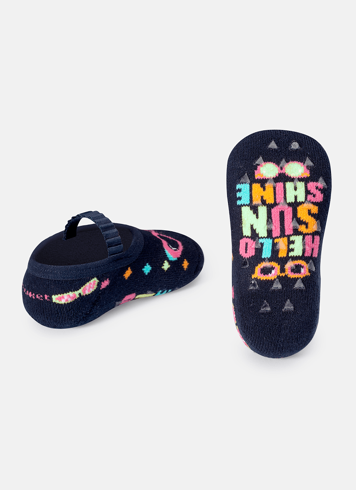Meia com modelagem sapatilha atoalhada com desenho divertido de óculos coloridos. Produzida com algodão macio em sua maior parte poliamida. Possui acabamento em viés e elástico texturizado confortável. Solado com antiderrapante com aroma de cheirinho de talco. Indicação de uso: Ideal para uso no dia a dia em casa, praticar exercícios e brincadeiras sem calçado. Instruções de Lavagem: Lavagem a mão Não alvejar Instruções de Conservação: Não secar em tambor Não passar Não limpar a seco (MAIS INFORMAÇÕES, VIDE NA ETIQUETA) Instruções de Garantia: Deverá ser encaminhado dentro na embalagem original, acompanhado de nota fiscal e com todos os itens constante na solicitação da compra.
