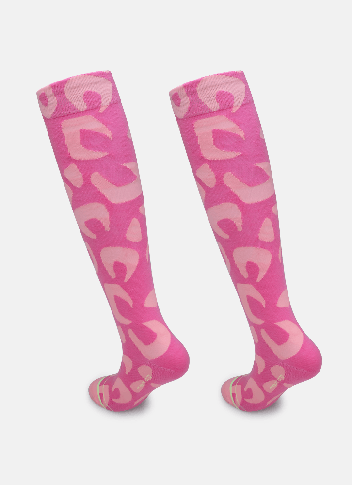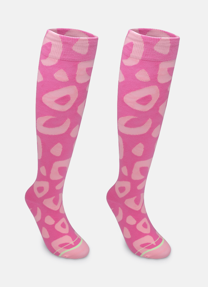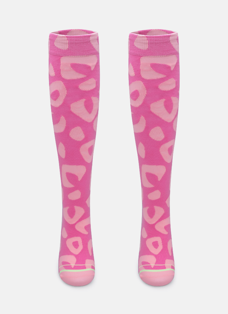 Meia 3/4 com desenho de animal print de onça, possui cano longo abaixo do joelho.