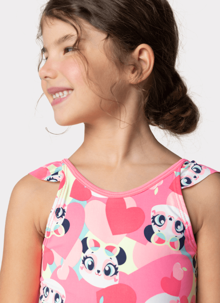 Maiô kids Panda Romântico. Possui aplique de babado no ombro e ajuste nas costas.