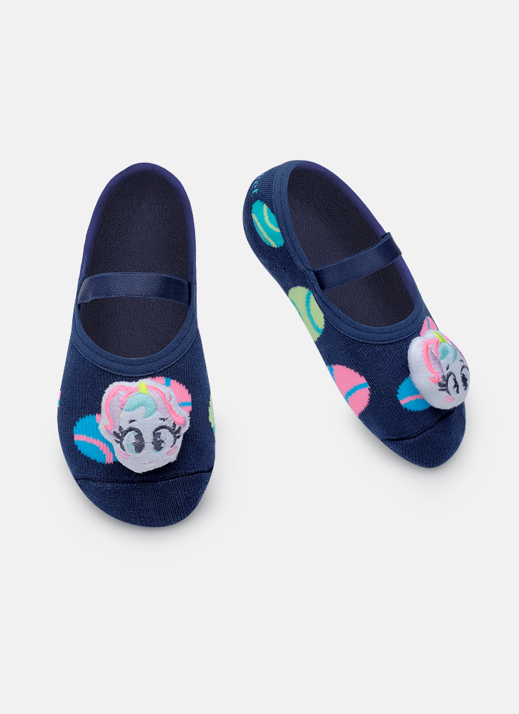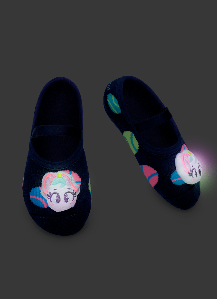 Meia com modelagem sapatilha atoalhada com desenho divertido tema unicórnio Possui aplique de unicórnio com Led que é ativado a cada pisada Produzida com algodão macio em sua maior parte e poliamida no desenho. Possui acabamento em viés e elástico confortável. Solado com antiderrapante com aroma de morango. Indicação de uso: Ideal para praticar exercícios e brincadeiras sem o uso de calçado e no dia a dia em casa. Instruções de Lavagem: Lavagem a mão Não alvejar Instruções de Conservação: Não secar em tambor Não passar Não limpar a seco (MAIS INFORMAÇÕES, VIDE NA ETIQUETA) Instruções de Garantia: Deverá ser encaminhado dentro na embalagem original, sem indicações de uso ACOMPANHADO DE NOTA FISCAL E com todos os itens constante na solicitação da compra.