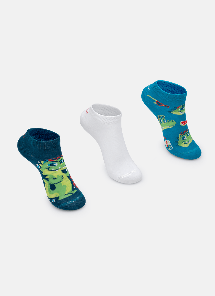 Kit com três pares de meias de jacaré em algodão macio, fio de acrílico e poliamida no desenho, sendo duas com desenhos divertidos e uma em cor lisa. Possuem cano confortável de altura curta. Indicação de uso: Ideal para usar com calçados fechados. Instruções de Lavagem: Lavagem a mão Não alvejar Instruções de Conservação: Não secar em tambor Não passar Não limpar a seco (MAIS INFORMAÇÕES, VIDE NA ETIQUETA) Instruções de Garantia: Deverá ser encaminhado dentro na embalagem original, sem indicações de uso ACOMPANHADO DE NOTA FISCAL E com todos os itens constante na solicitação da compra.