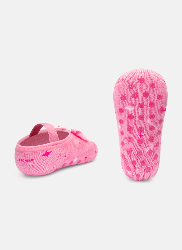 Meia com modelagem de sapatilha desenhada, aplique do laço aplicado e costurado na frente da meia. Produzida com algodão macio em sua maior parte poliamida. Possui acabamento em viés e elástico confortável. Solado com antiderrapante com aroma cheirinho de bebê Indicação de uso: Ideal para compor com a roupinha sem o uso do calçado e usar no dia a dia nos primeiros passos. Instruções de Lavagem: Lavagem a mão Não alvejar Instruções de Conservação: Não secar em tambor Não passar Não limpar a seco (MAIS INFORMAÇÕES, VIDE NA ETIQUETA) Instruções de Garantia: Deverá ser encaminhado dentro na embalagem original ACOMPANHADO DE NOTA FISCAL E com todos os itens constante na solicitação da compra.