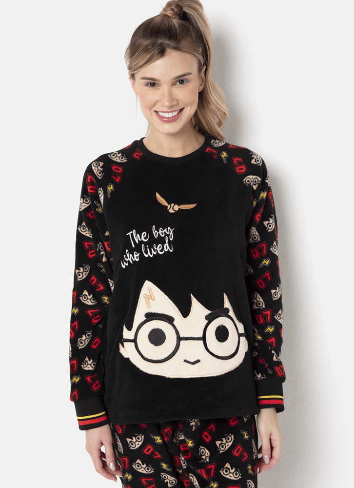 Pijama em coral fleece com estampa de Harry Potter Puket <3 Possui toque macio devido a sua característica felpuda o que torna o pijama super quentinho e confortável. Ideal para aconchegar noites frias. - Mangas longas com punhos em ribana; - Gola redonda; - Aplique 3D do rostinho do personagem - Calça estampada com elástico macio na cintura; - Calça modelagem reta com punhos em ribana; Lavagem e conservação: Lavagem à mão; não alvejar; não secar em tambor; não passar; não limpar a seco (para mais informações, consulte a etiqueta fixada ao produto). Garantia: Deverá ser encaminhado dentro da embalagem original; sem indicações de uso; acompanhado de nota fiscal e com todos os Itens constante na solicitação da compra.