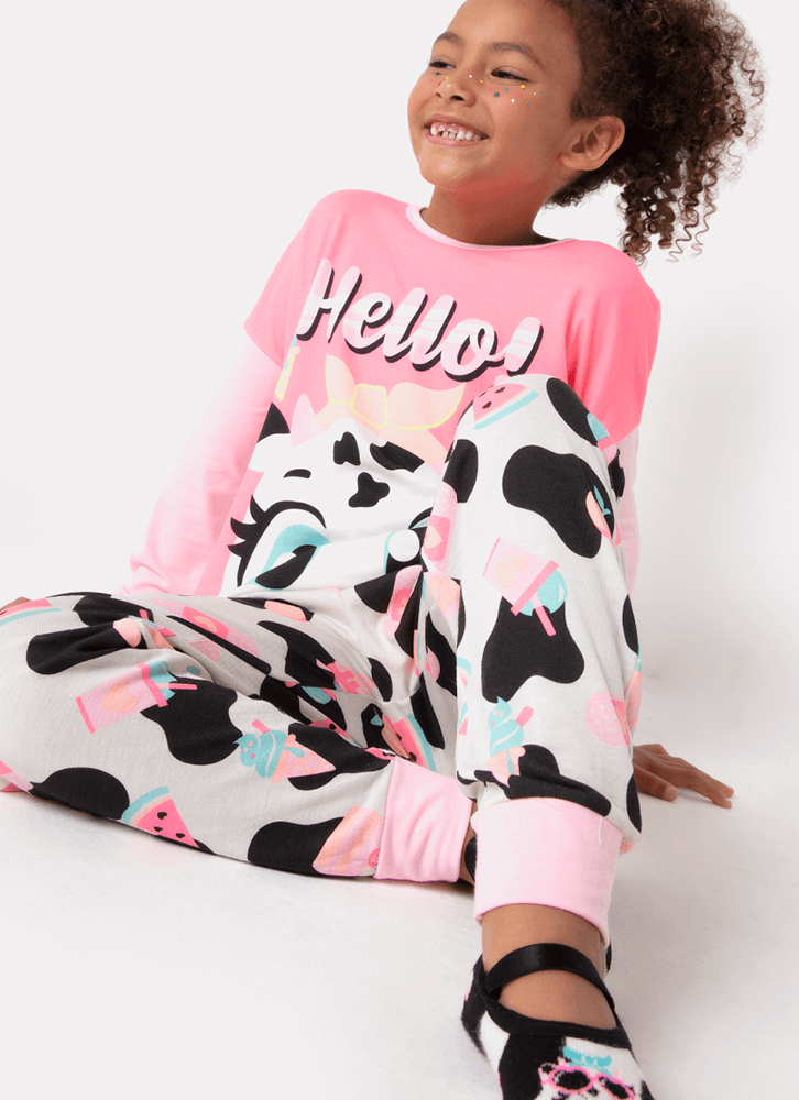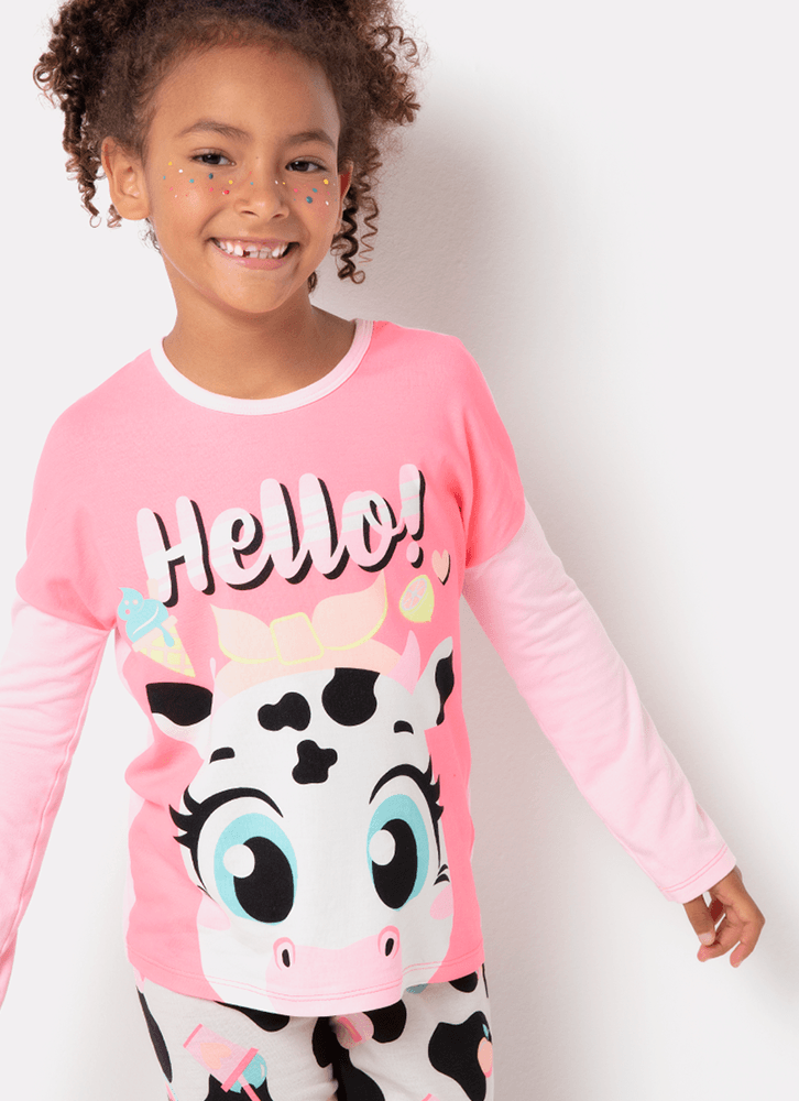 Pijama de viscolycra com toque macio e estampa divertida de vaquinha <3 Para noites tranquilas de sono e momentos de relaxamento em casa. O Pijama da Puket proporciona conforto durante a vestibilidade e ótimo caimento. - Blusa com manga comprida e estampa frontal. - Gola redonda. - Tecido cor sólida nas costas da blusa. - Calça estampada com elástico macio embutido na cintura. - Tecido: Blusa e calça de viscose e elastano. Lavagem e conservação: Lavagem à mão, não alvejar; não secar em tambor; não limpar a seco; secagem em varal por gotejamento a sombra; não passar ou utilizar vaporização; (mais informações, vide na etiqueta). Garantia: Deverá ser encaminhado dentro da embalagem original, sem indicações de uso, acompanhado de nota fiscal e com todos os itens constante na solicitação da compra.