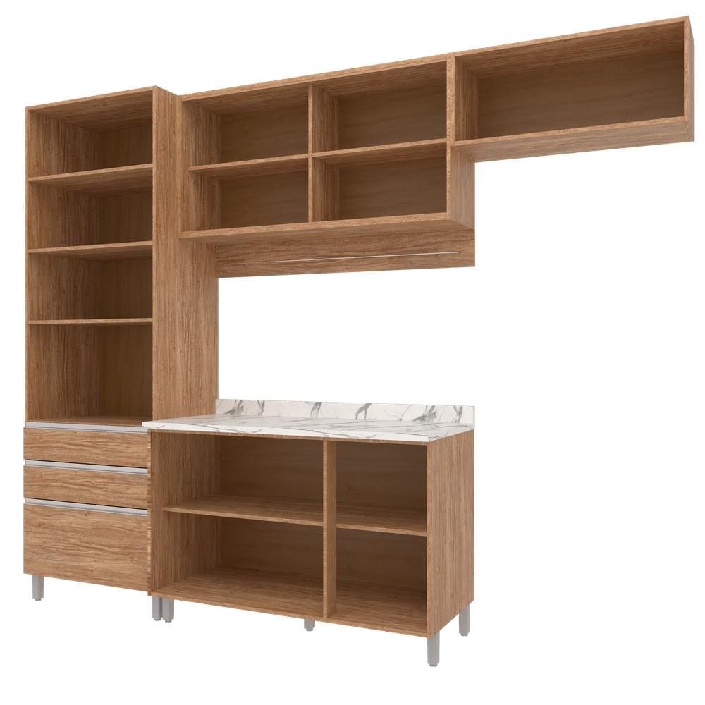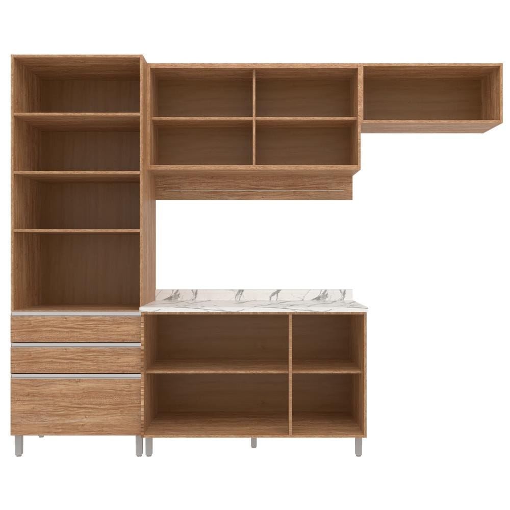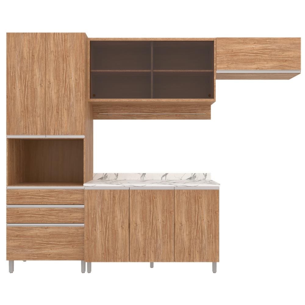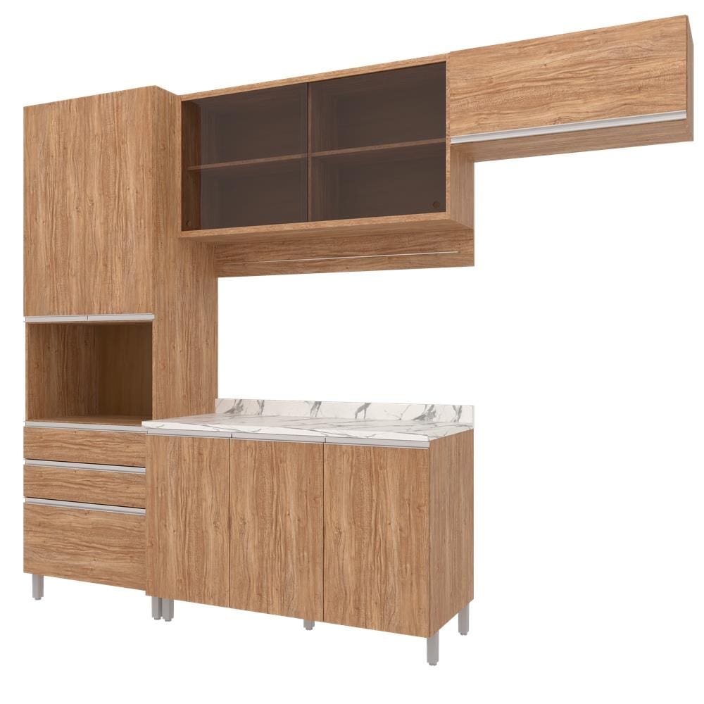 Características Gerais: - Conjunto 4 peças: armário aéreo com vidro, paneleiro, balcão triplo e armário sobre geladeira