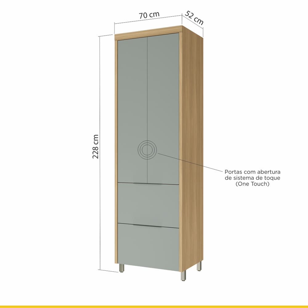 Paneleiro Marquesa 70cm: Altura de 228 cm, ideal para organização vertical, com 2 gavetas e portas com sistema de toque (One Touch).
