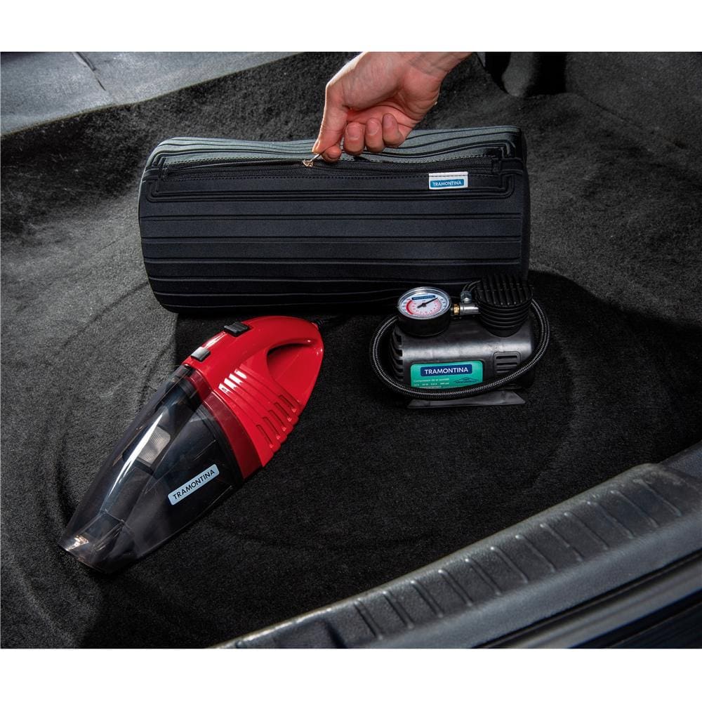 Ele conta com um aspirador para carro 12 V e um compressor de ar portátil, também com ligação pela entrada 12 V do veículo. Tudo protegido por um lindo estojo preto em EVA, que pode ser fixado no porta-malas, através do seu velcro.