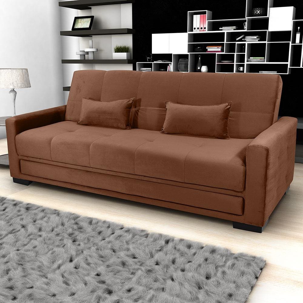 Conteúdo da Embalagem: -1 Sofá-Cama 3 Lugares Matrix Grazi Revestido em Tecido Veludo - 206cm de largura; -2 Almofadas.