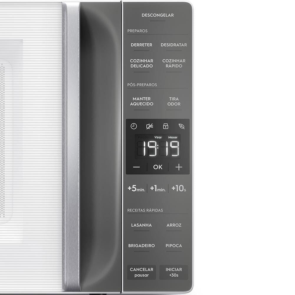 Características Gerais: 4 funções diferentes para facilitar os preparos de seu dia a dia: - Derreter: Alimentos derretidos no ponto certo. Ideal para manteiga e chocolate. - Desidratar: Faça chips de vegetais e frutas ou desidrate ervas para conservá-las. - Cozinhar Delicado: Para alimentos que necessitam de cozimento suave, como vegetais macios e peixes. - Cozinhar Rápido: Oferece agilidade no preparo de alimentos firmes, como carne bovina e legumes como batata. Descongelamento Assistido Indica, por meio de um aviso sonoro e luminoso, o momento certo de virar ou mexer os alimentos, garantindo um resultado mais uniforme. Função Manter Aquecido Garante que seu prato fique aquecido até a hora do consumo para você aproveitar o melhor de cada refeição. Função Tira Odor O sistema de recirculação do ar interior suaviza os odores deixados por preparos anteriores e mantém o micro-ondas sempre pronto para a próxima receita. Quatro Receitas Pré-Programadas Oferece a facilidade que sua rotina merece. Com apenas um toque, faça pratos conhecidos: lasanha, arroz, brigadeiro e pipoca. Função Economia de Energia Desliga as luzes do painel quando o micro-ondas não está em uso. Oferece classificação energética A Sendo econômico para o dia a dia. Função Trava-Painel Garante que o painel não seja acionado ou alterado indevidamente por crianças, por exemplo, e impede que os comandos sejam acionados durante a limpeza do painel. Função Mudo Configure seu micro-ondas para não emitir som durante o uso e mantenha o ambiente silencioso sempre que quiser. Função Limpa Fácil Facilita a remoção de gorduras e respingos provocadas pelo uso. 1100W para suas receitas Potência ideal para diversos tipos de preparos QR Code Você pode acessar mais detalhes sobre os benefícios do seu produto na palma de sua mão.