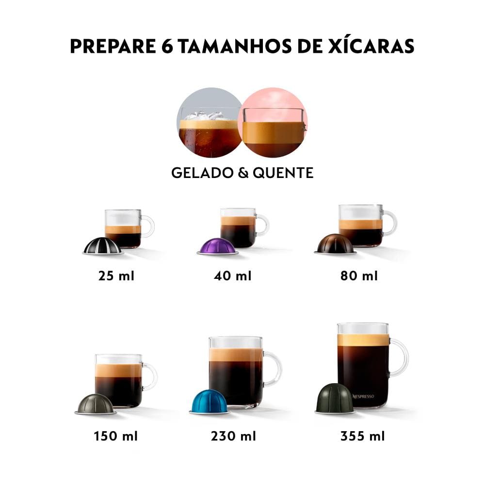Com a Cafeteira Nespresso Vertuo Pop Preta você terá sempre o mesmo resultado na xícara: café Nespresso feito na hora, com crema naturalmente formado e café encorpado. Mas agora, em uma versão mais ousada, com uma cor vibrante e diferente para combinar com o seu estilo! Compacta, prática e fácil de manusear a Vertuo Pop, além de muito elegante, traz versatilidade com quatro tamanhos de xícaras, desde Espressos a Mugs, basta escolher a cápsula Nespresso e o seu café estará pronto ao toque de um botão. A Vertuo Pop da Nespresso fica perfeita em todos os ambientes e ainda tem tecnologias Bluetooth e Wi-Fi, oferecendo uma experiência completa para você poder desfrutar de deliciosas bebidas a qualquer hora do dia. Beleza e praticidade para você saborear um Espresso perfeito sempre que quiser. Aproveite!